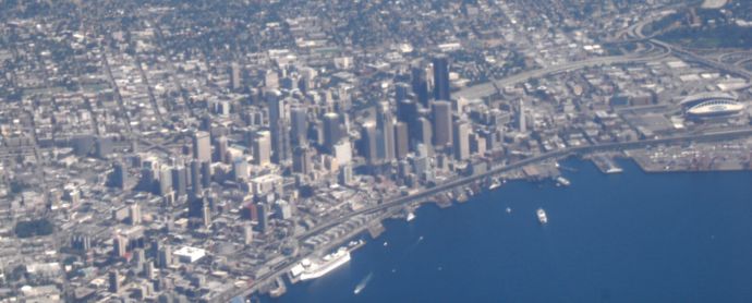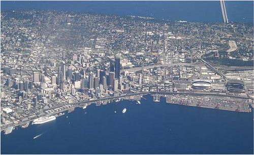 Note the cruise ship docked in Seattle, and the stadium to