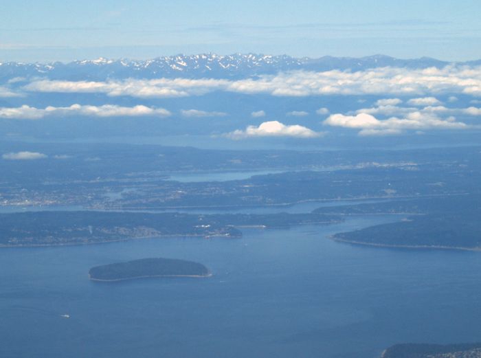 Flying over Mercer Island, Seattle is in the top left, Olympics in the background.