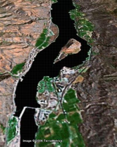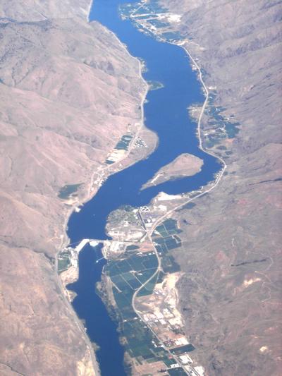 | Some river valley somewhere in the Pacific “NE.” (A friend sugggested it was The Dalles, Oregon, but by chasing Google-earth all the way up the Columbia River, I found this island and dam near Wenatchee.) | |