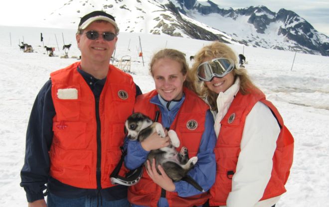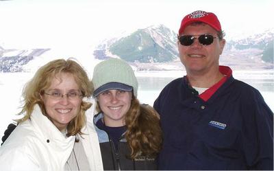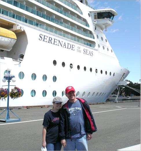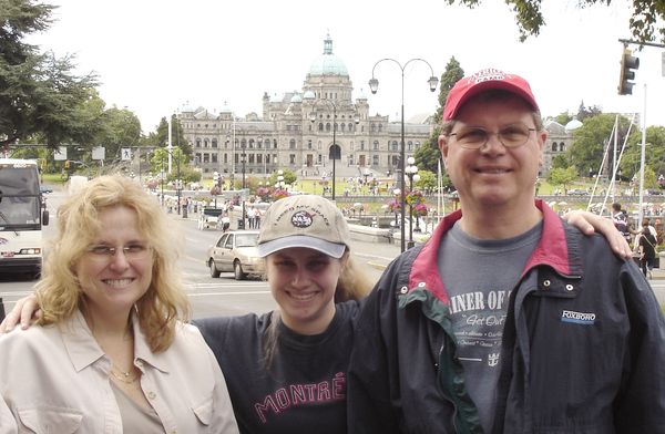 Leah, their daughter, and Harry in front of our ship in Victoria.
