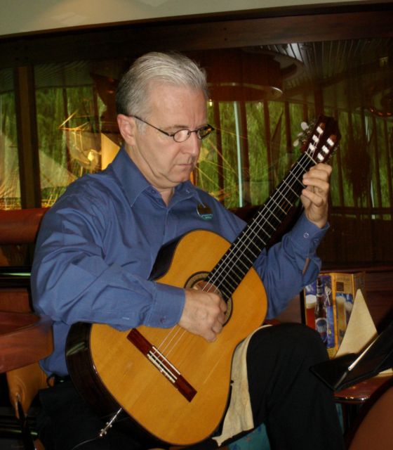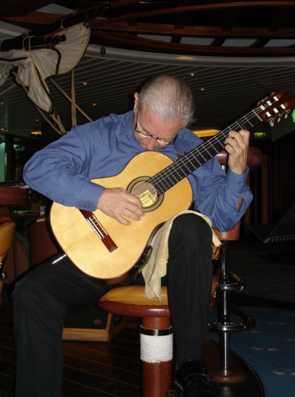 He was absolutely stellar! Early in the cruise, Stephen would do a “concert” in the Schooner bar, and it would be essentially just Michael and me as his audience (others around were talking and not focused on his playing as we were), so we got a combination private concert and academic lecture about the music, the composer or famous guitarists who’d played the piece(s), and so on. Then he played a couple of pieces he’d written (WONDERFUL pieces! He’s a real talent!); so, ever after, when we were in the Centrum (the big ship’s lobby) or other more public venue, I’d ask him to play one of his pieces – and he’d demur; but I said (mock archly) that “*I* was the customer, so indulge me,” – and he would play one or more. As we raved about him, we got more people to come to our “private” concerts too.