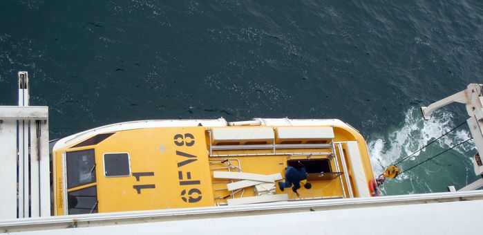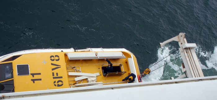 The launches are moved outboard, lowered part way, then stopped.