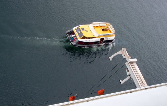 Waiitng to come alongside the hatch where passengers and crew embark.