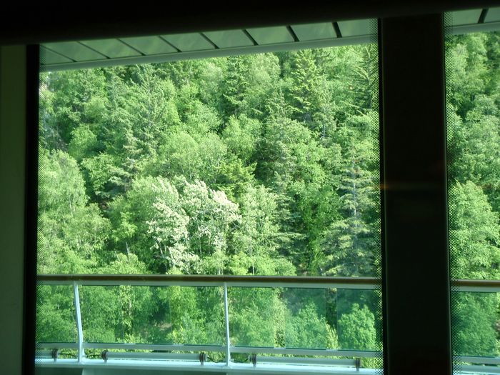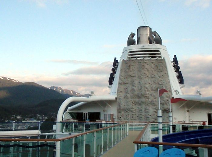 The rock wall at dawn, pulling into Juneau. (You can see the rising sun hitting the mtn tops.)