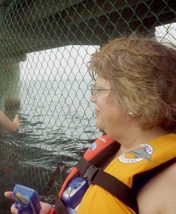 We were backed up in a line against the chain link (our group was in the outermost pen), standing barefoot on a very painful grating that was about 3 feet wide; and waves were periodically coming by and upsetting my balance.