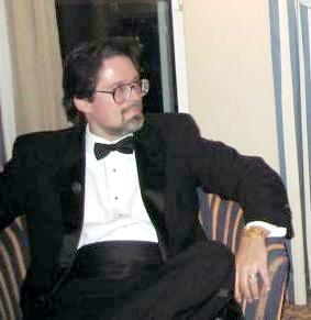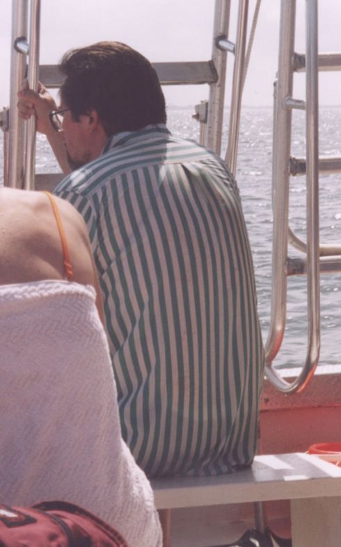 ![]() In front of a Titanic screen | ![]() In front of the lighted staircase in the Centrum Don't he jes' look like a secret agent? Hunky! |