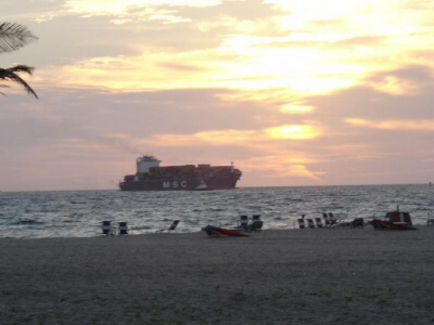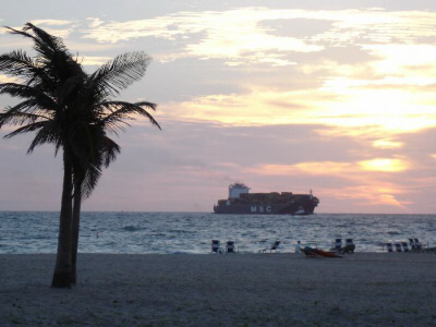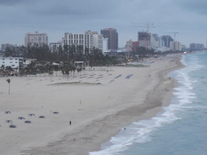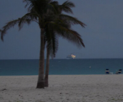 Down on the beach at sunset. The Lago Mar is about 5000 feet, or four hotels, from the inlet to Port Everglades, the major shipping port (and cruise ship port we sailed from) in Fort Lauderdale.