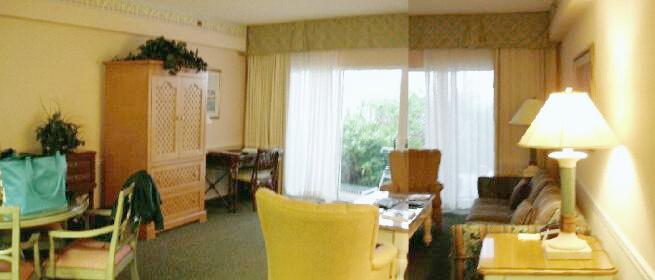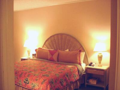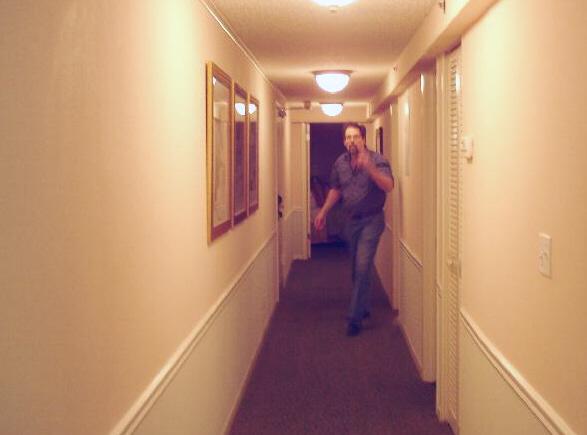 This is the hallway INSIDE our suite! Mike is coming out the master bedroom, beyond him is the twin-bed room. I’m standing down in the living room.) (Oh yeah, a bathroom in the master plus a bathroom in the hall!)