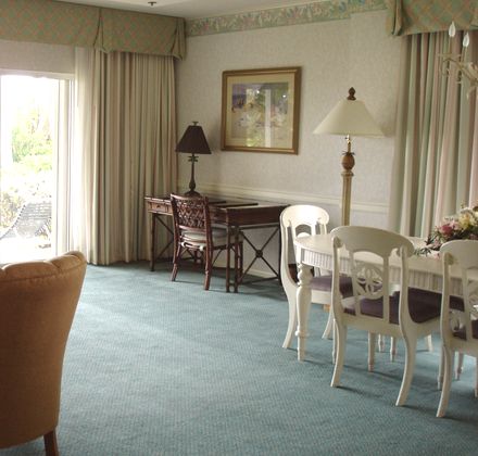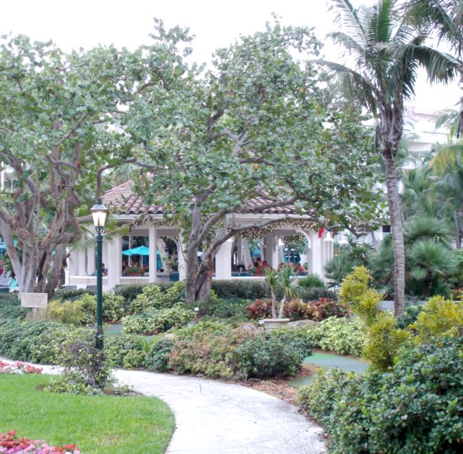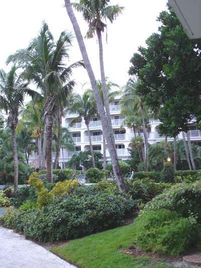 The view rightwards from outside our suite on the evening we arrived, when it was still gray and drizzly. The pool is just beyond those little lounge chairs you can barely see.
