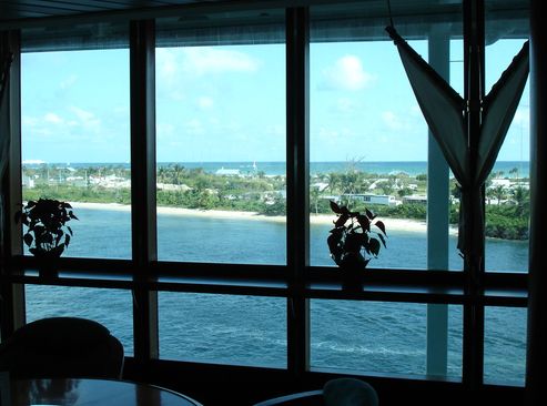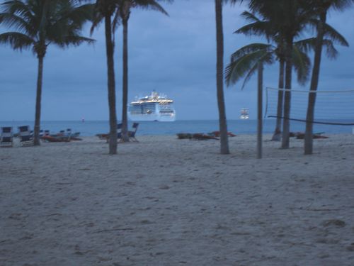 The evening cruise-ship exodus included this Norwegian Cruise liner. (The ship is sailing out the inlet of Port Everglades, just beyond the condo-building, which sits directly on the edge of the inlet.) I SOOOOO wanted to wait and see the Queen Mary II leave, but we were running late for our Michael-arranged dinner party with other cruisers; I heard the QMII’s underway horn, as I was running back to the resort.… I did get to see her the final day; she docked at 6 a.m.; we docked at 7.