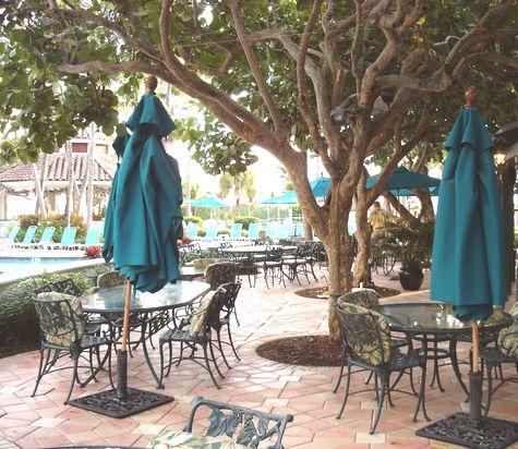 The outside dining area; the pool to the left, the dining room to the right. There were these weird-cool birds that make a funny chirping all over the place – but no one at the resort (any of the three times we’ve stayed there!) has any idea what kind of birds they are. You can see the roof of the … cabana? bar … in the center of the courtyard.