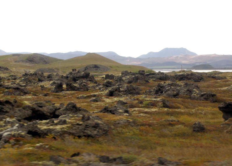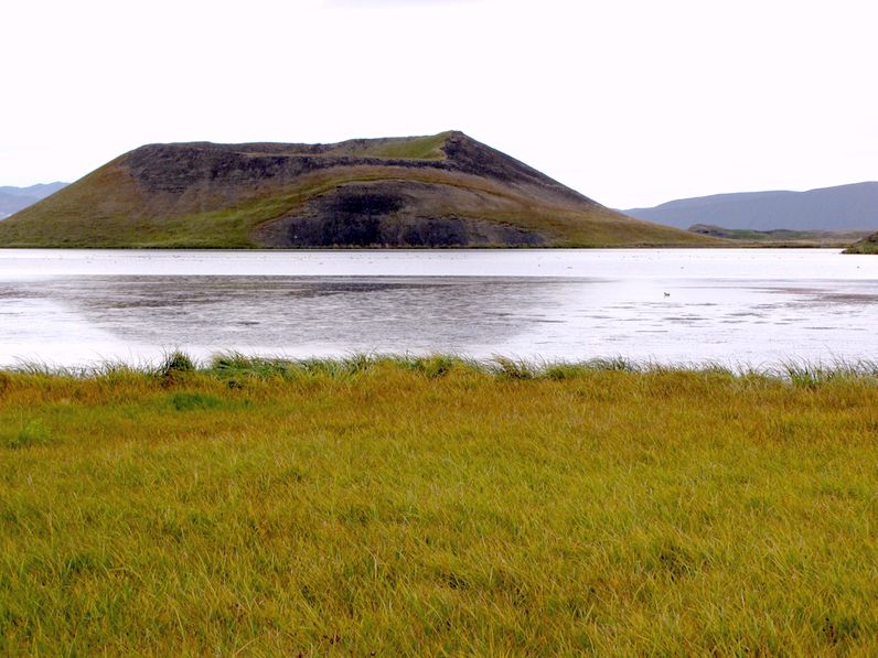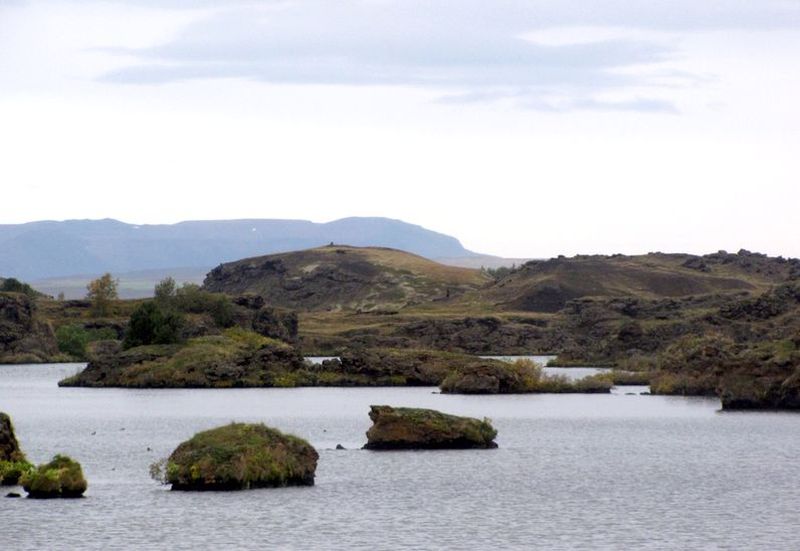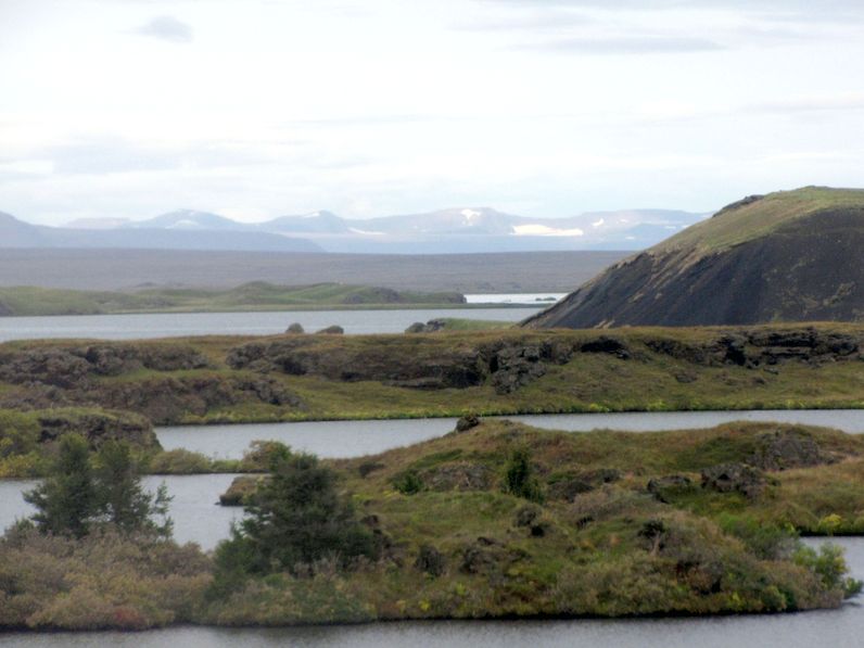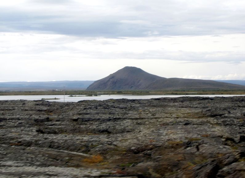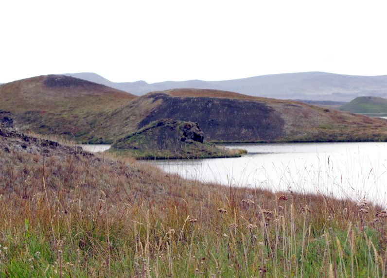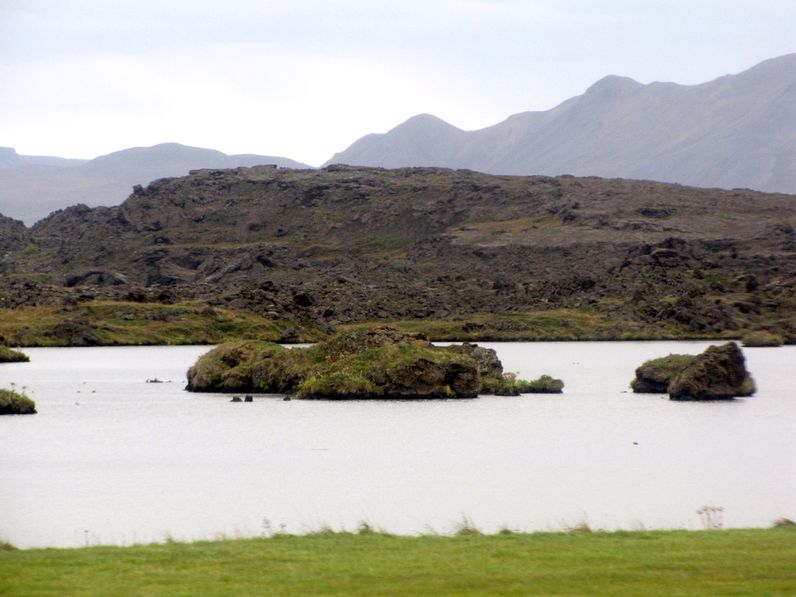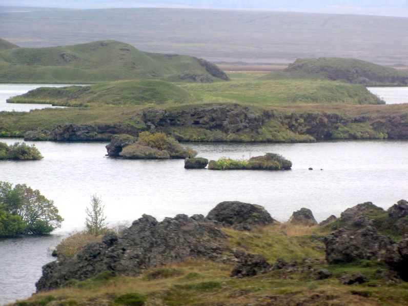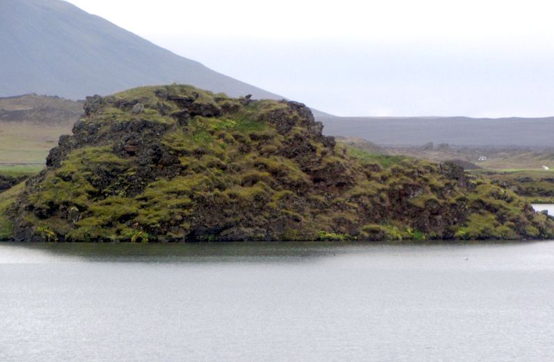 When the glowing lava encountered the lake some of the water-logged lake sediment was trapped underneath it. The ensuing steam explosions tore the lava into small pieces which were thrown up into the air, together with some of the lake. By repeated explosions in a number of locations, groups of craters built up and now dominate the landscape on the shore of Lake Mývatn and also form some of the islands in the lake. This type of lava formation is known as pseudocraters or rootless vents.