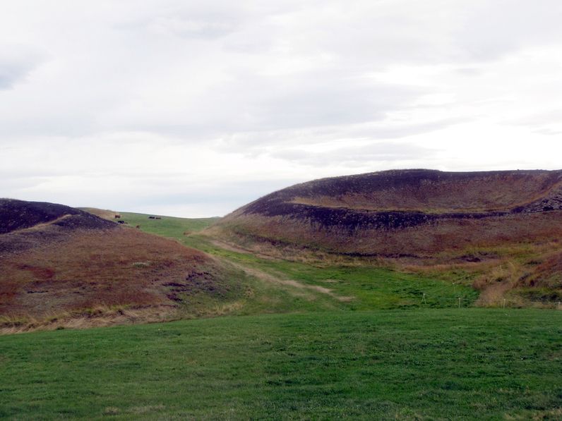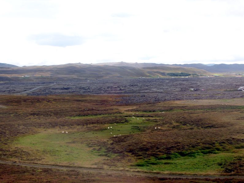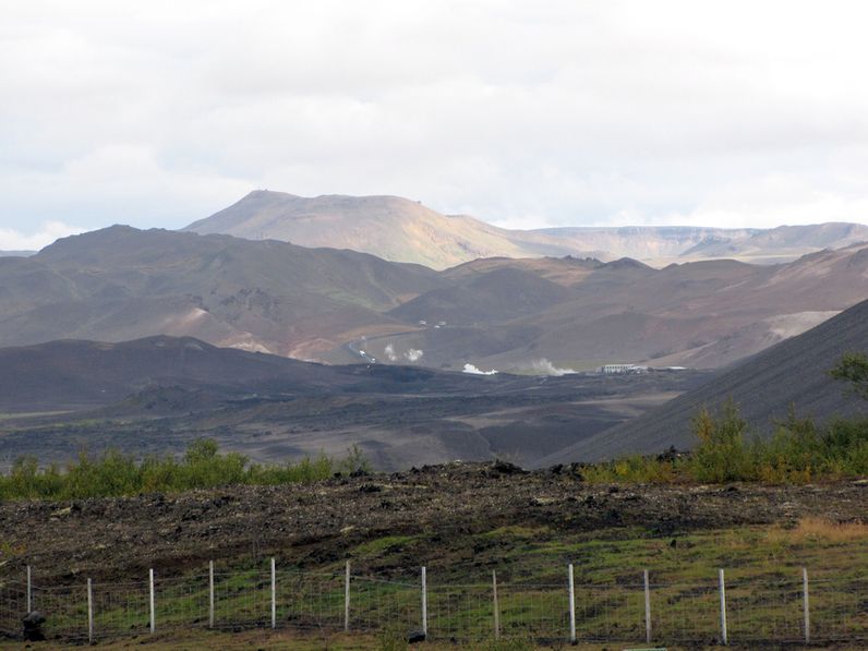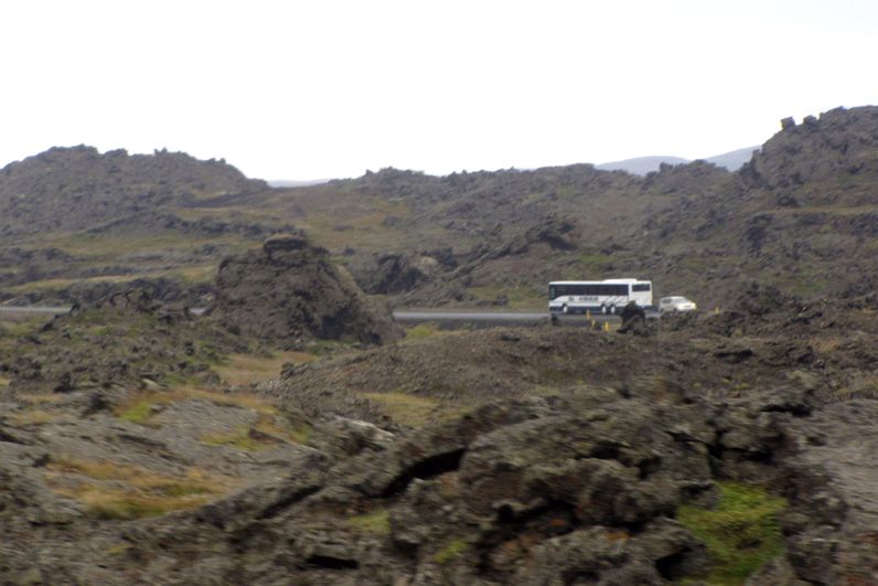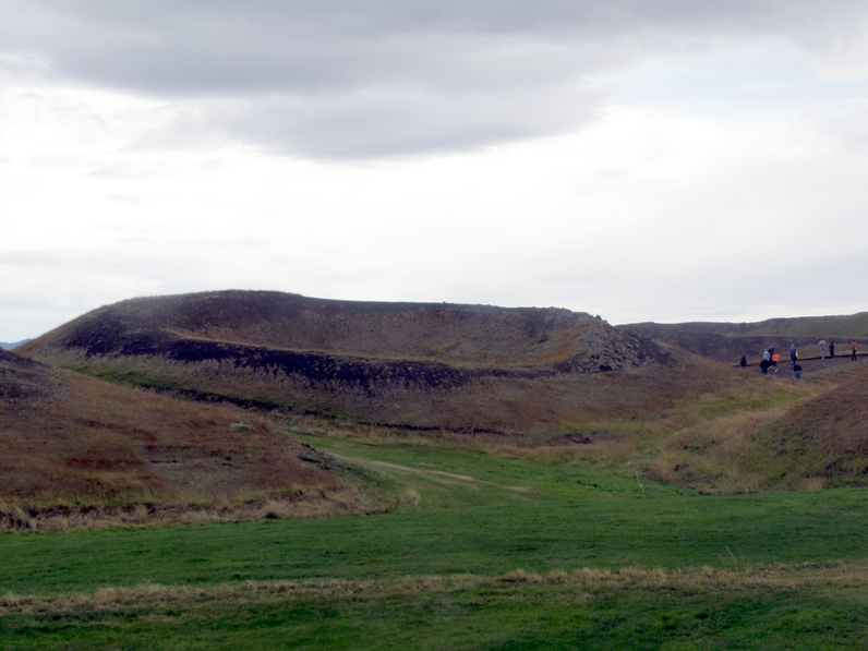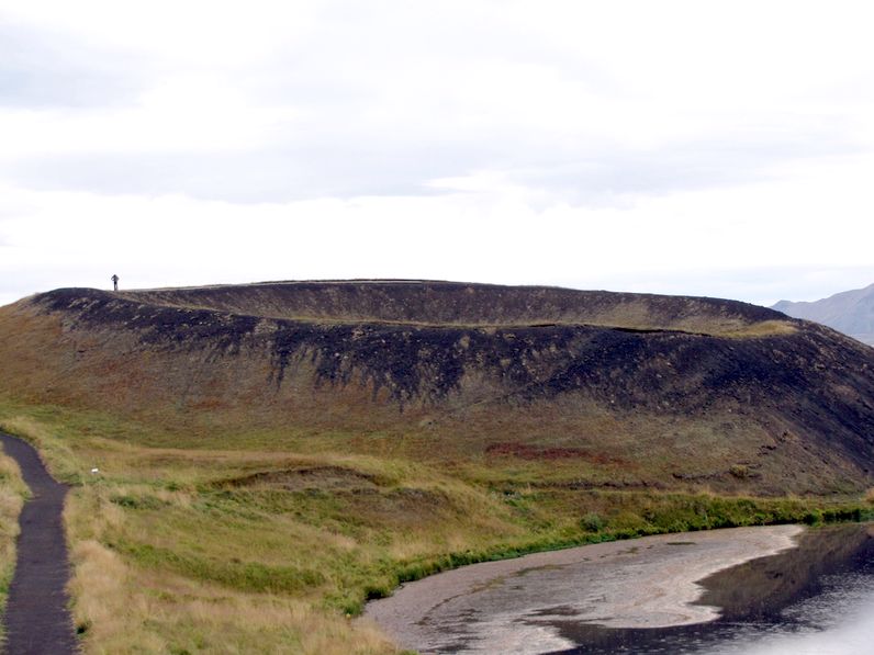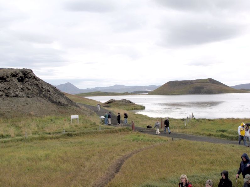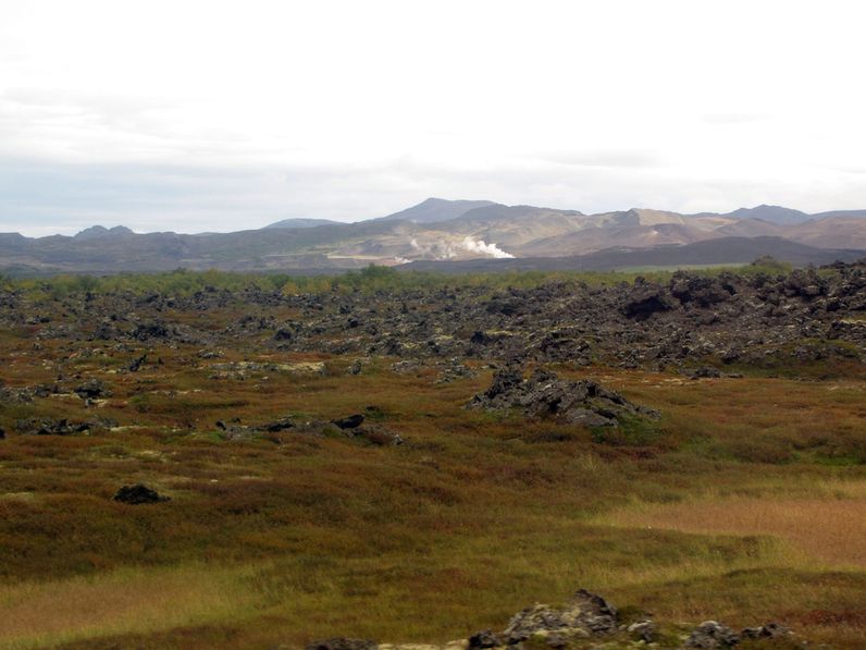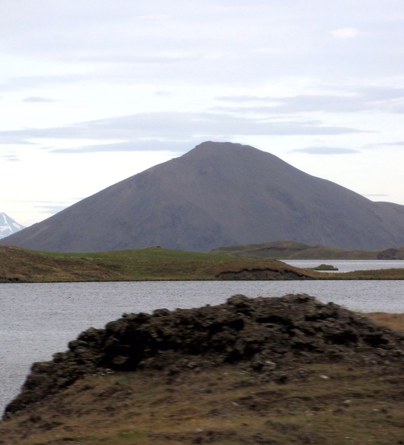 When the glowing lava encountered the lake some of the water-logged lake sediment was trapped underneath it. The ensuing steam explosions tore the lava into small pieces which were thrown up into the air, together with some of the lake. By repeated explosions in a number of locations, groups of craters built up and now dominate the landscape on the shore of Lake Mývatn and also form some of the islands in the lake. This type of lava formation is known as pseudocraters or rootless vents.