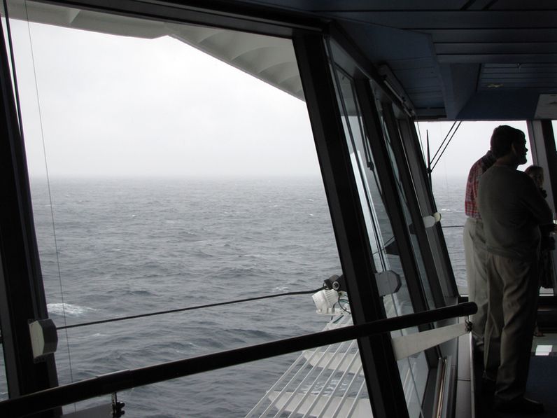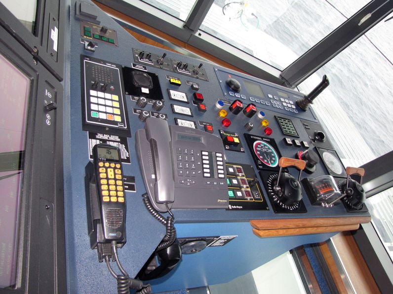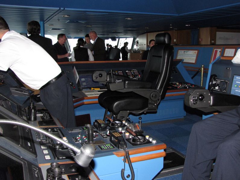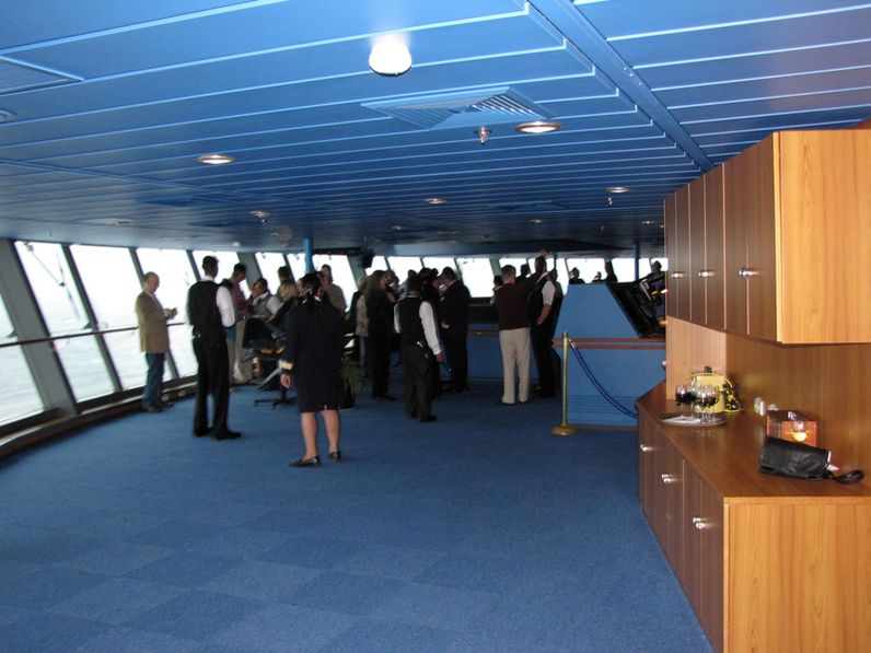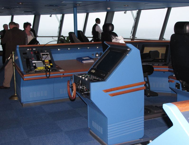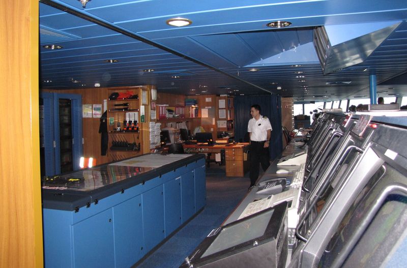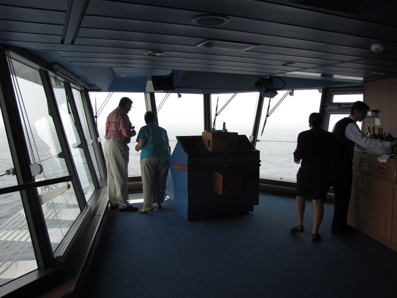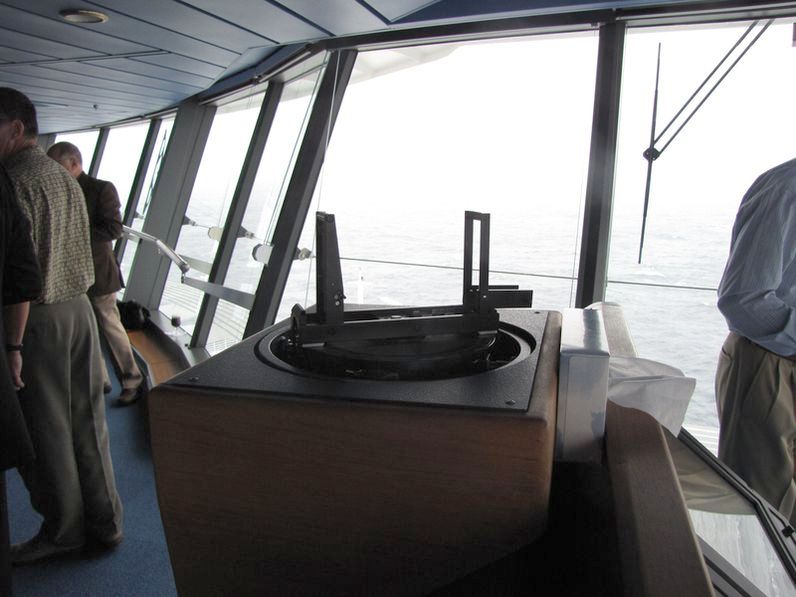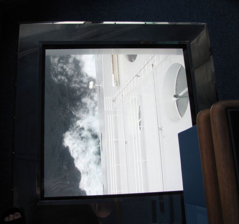Both bridge wings have a plexiglass window in the floor, so the captain can see the dock, or tugs or sea or whatever .