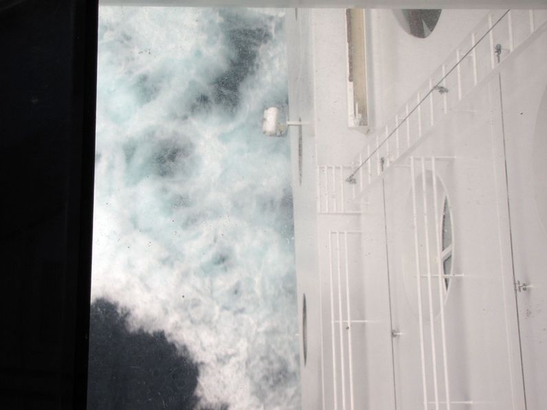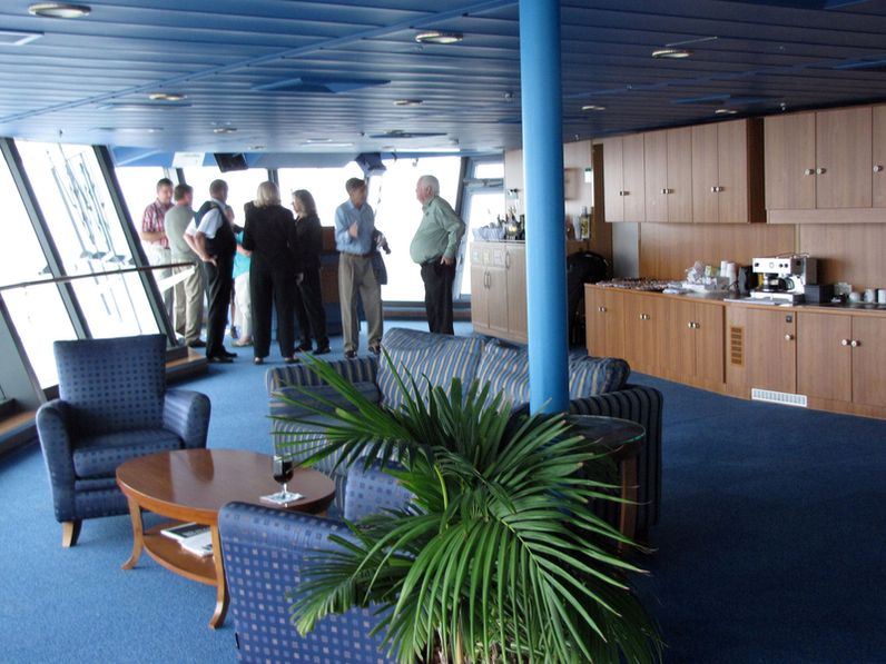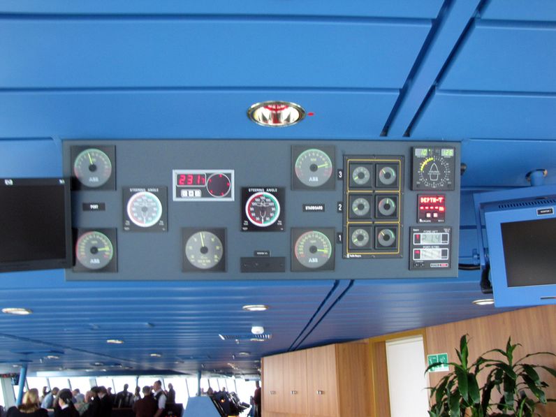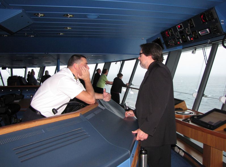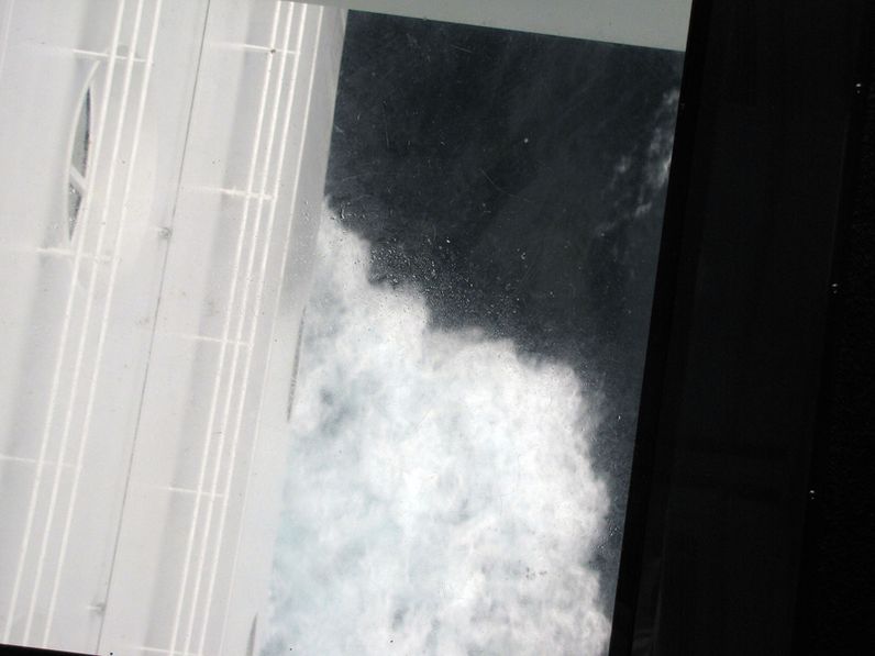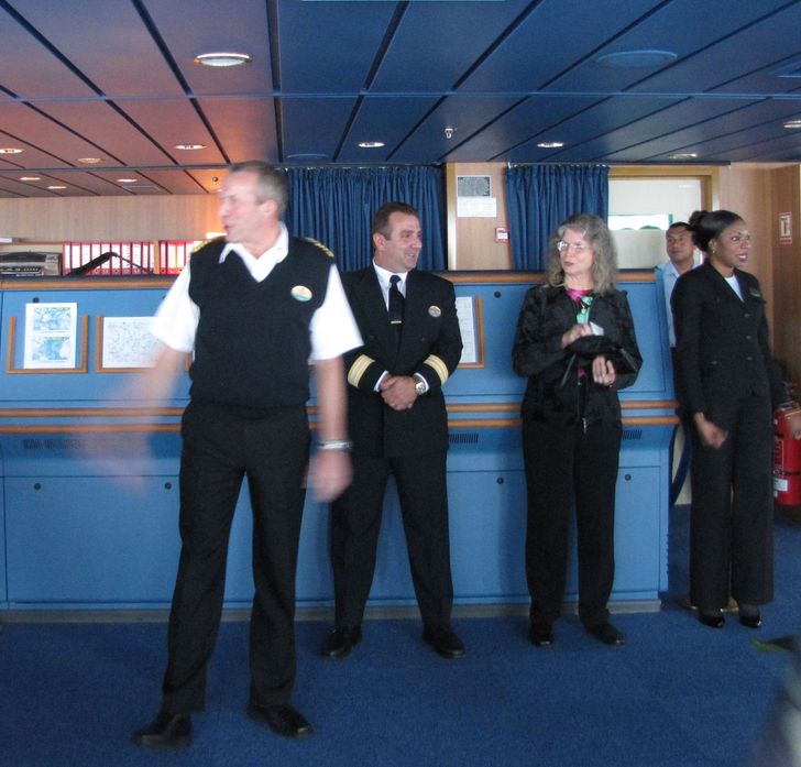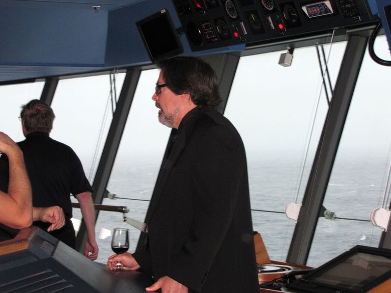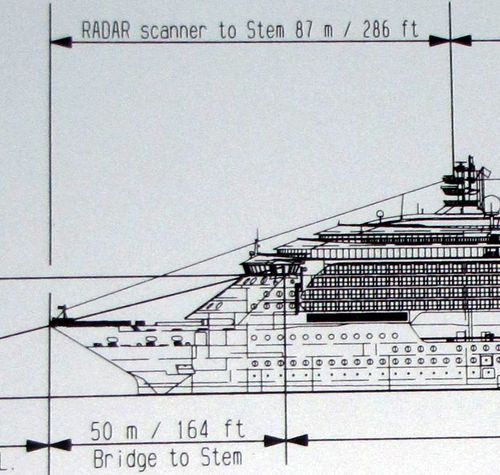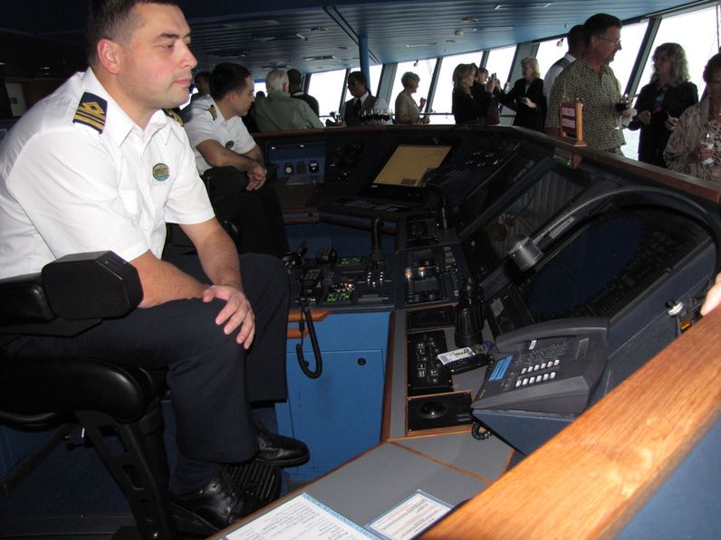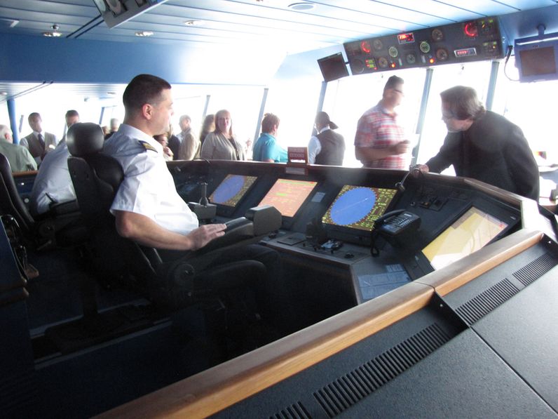 Both bridge wings have a plexiglass window in the floor, so the captain can see the dock, or tugs or sea or whatever .