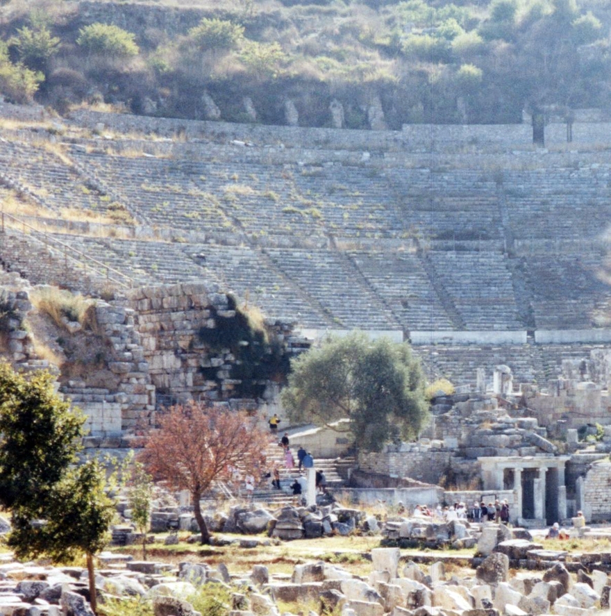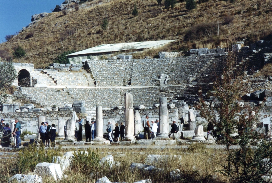 The Great Theatre is located on the slope of Panayir Hill, opposite the Harbor Street. It was first constructed in the Hellenistic Period, in the third century BC during the reign of Lysimachos, and during the Roman Period, it was enlarged and formed its current style that is seen today. It is the largest in Anatolia and has the capacity of 25,000 seats. The cavea has sixty six rows of seats, divided by two diazoma (walkway between seats) into three horizontal sections.