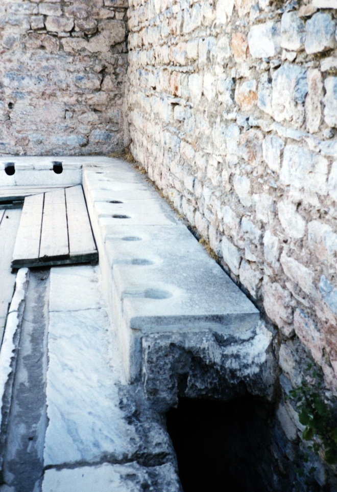 The Scholastica baths were built in the 1century a.d. The guides take great pleasure from of the tourist reactions to this 44-seat public privy. Look for the key-hole shaped “seats” that are cut into the marble shelf, (one would “back up” to sit down, eh?). The seats are over a trough with running water that carried the waste out into the ceramic sewer pipes under the streets and thence out into the harbor.