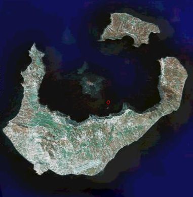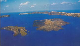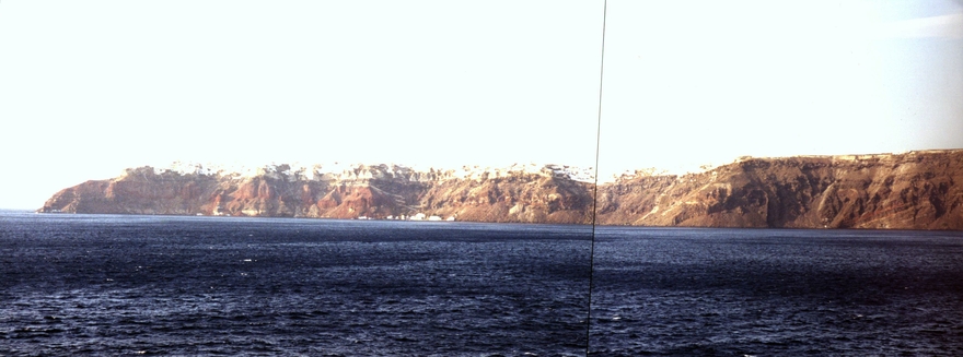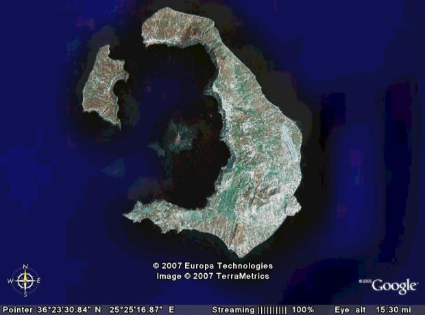 To the left is the tail end of Thira curling around toward the islands of Aspronisi and Thirasia (to the right, out of the picture).