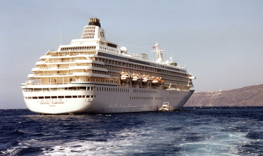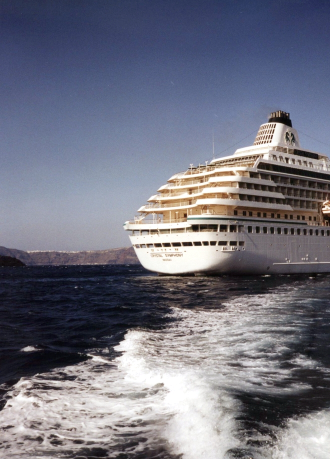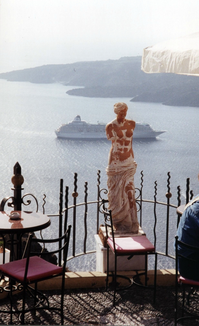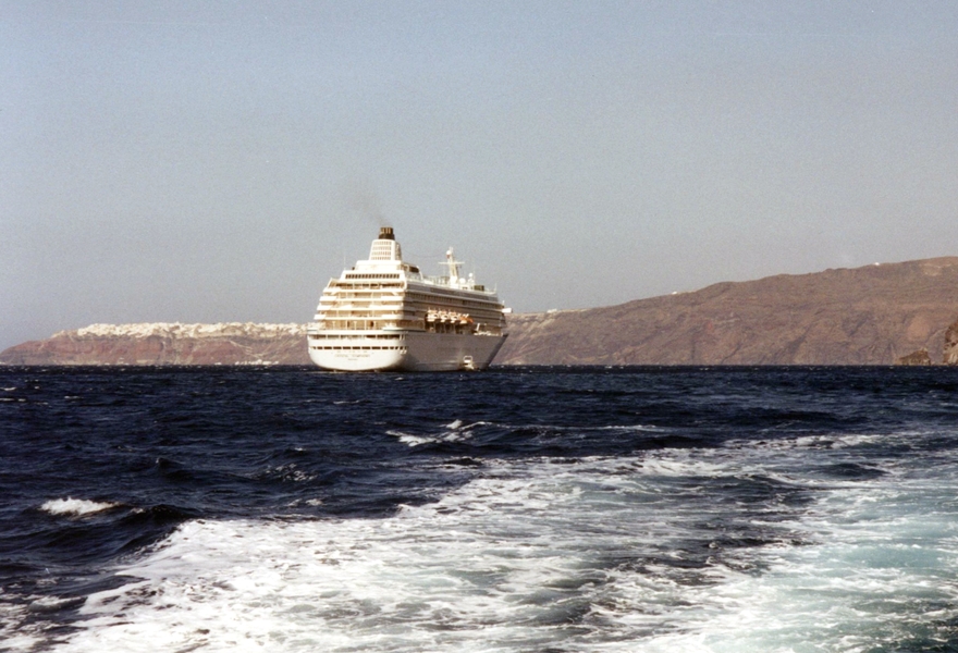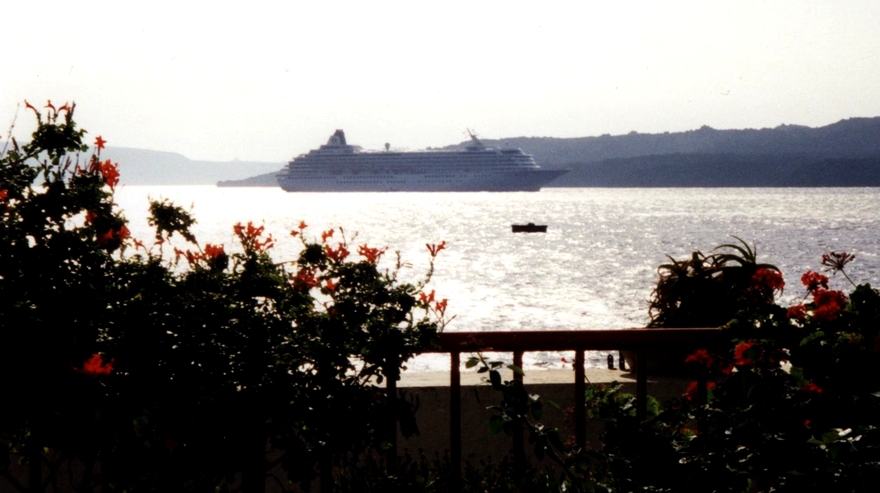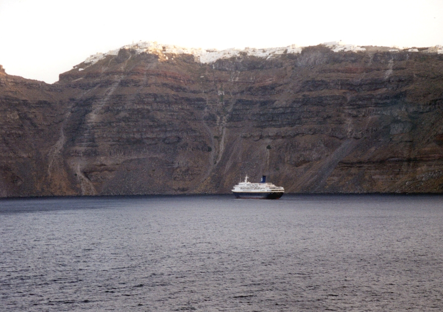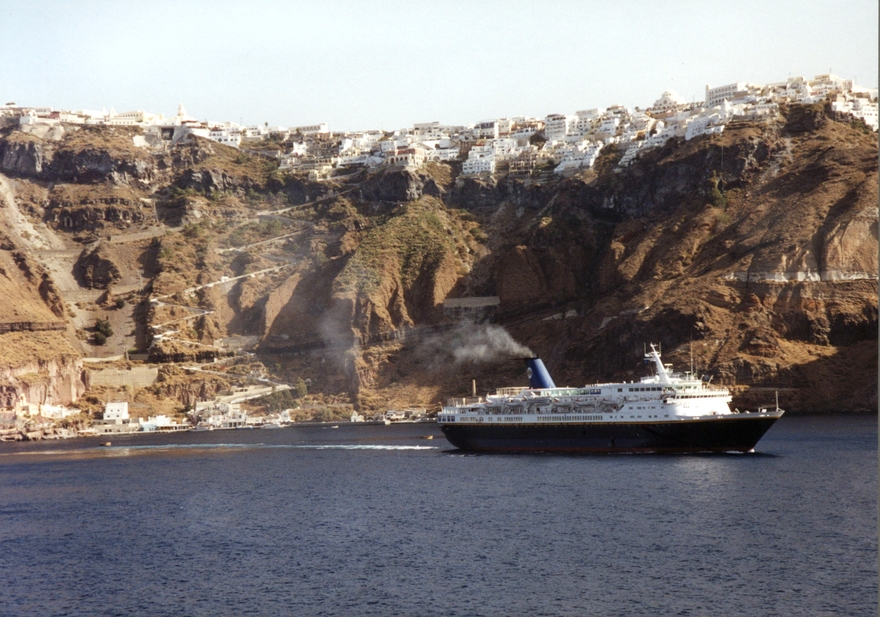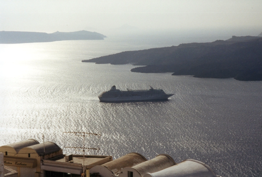 The cruise ship Olympic Countess below Fira town: We later moored next to this ship in Rhodes!
