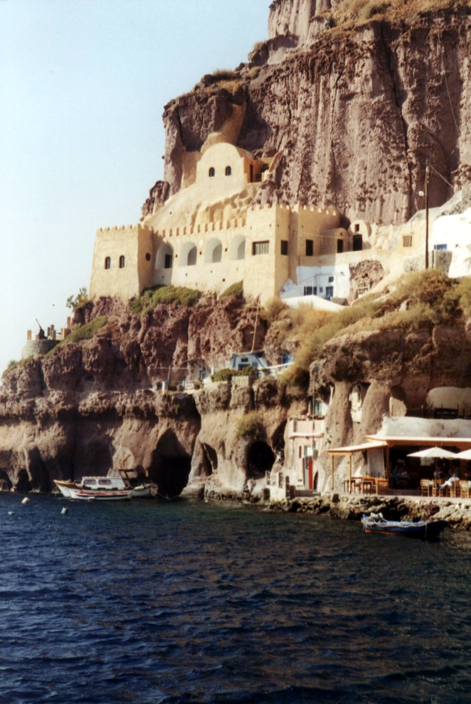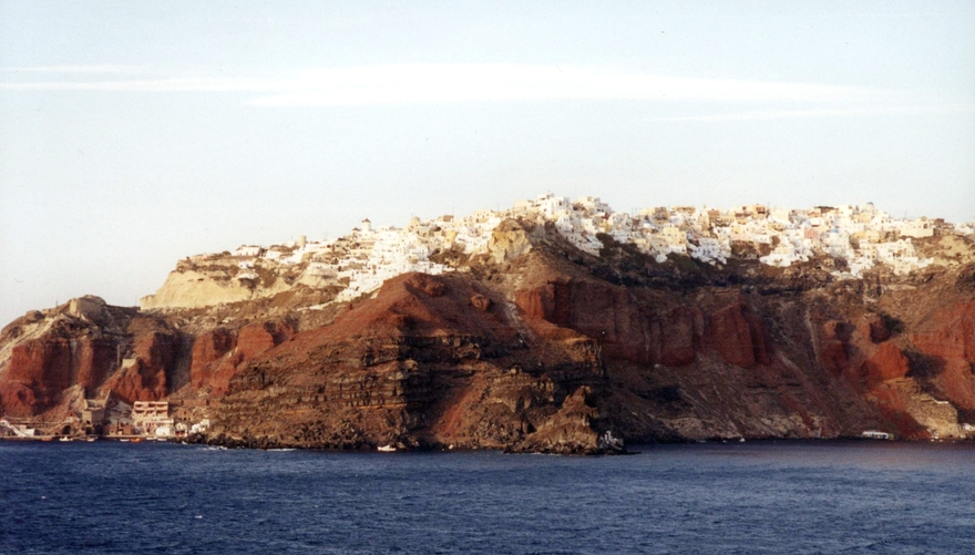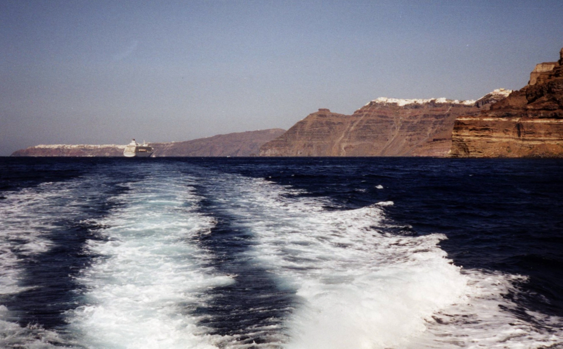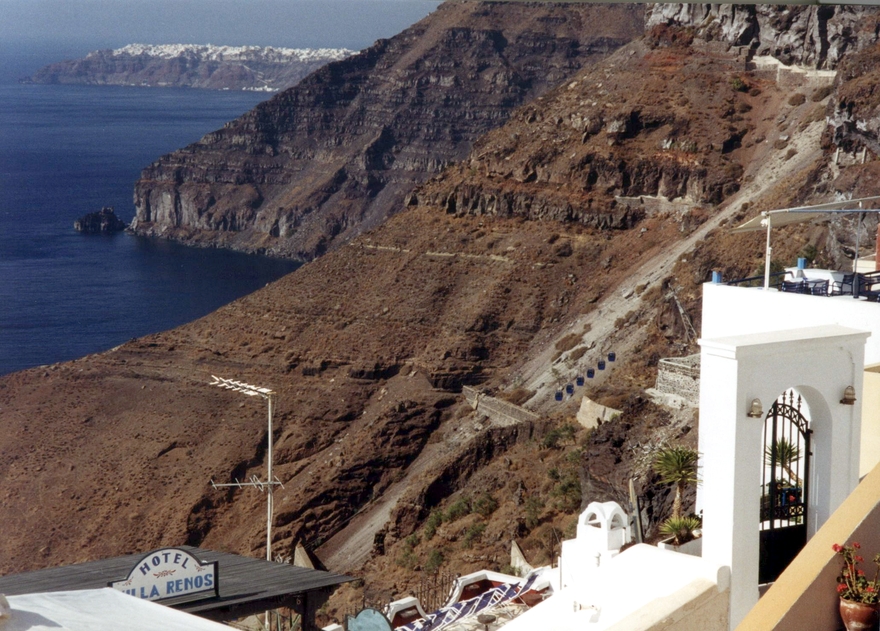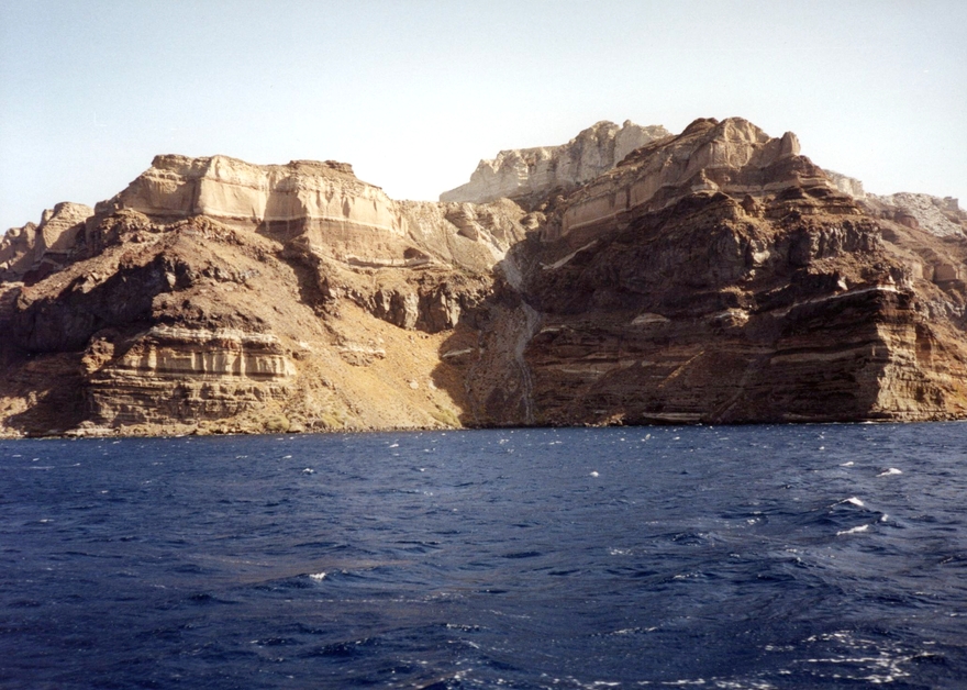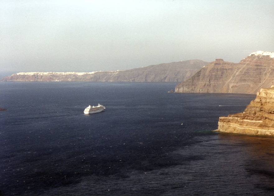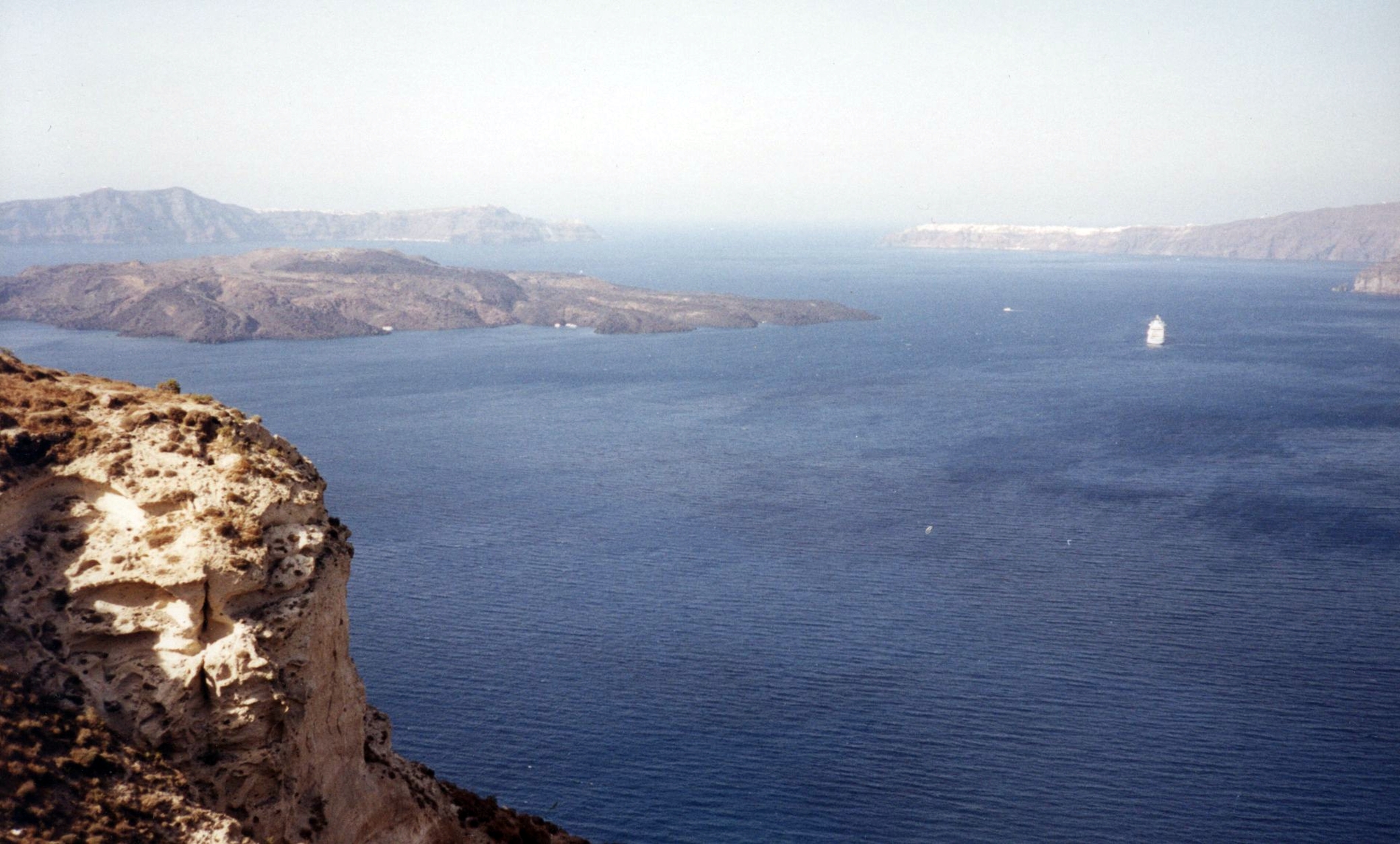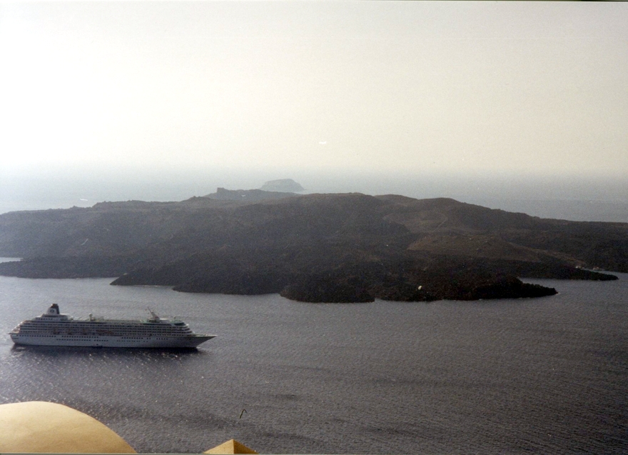 The Symphony (from the cliff-edge in Thira/Fira) between Thira and Nea Kameni. Aspronisi, the “White Island,” is in the far background. Aspronisi is so named because of the white tephra (volcanic rock) top layer, which is Minoan tephra from the 1650 b.c. eruption.