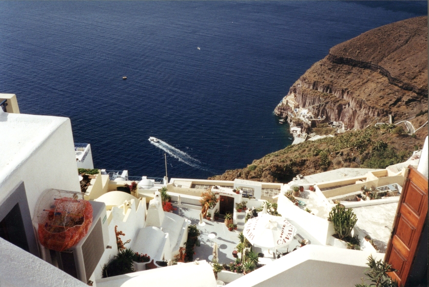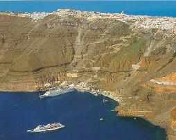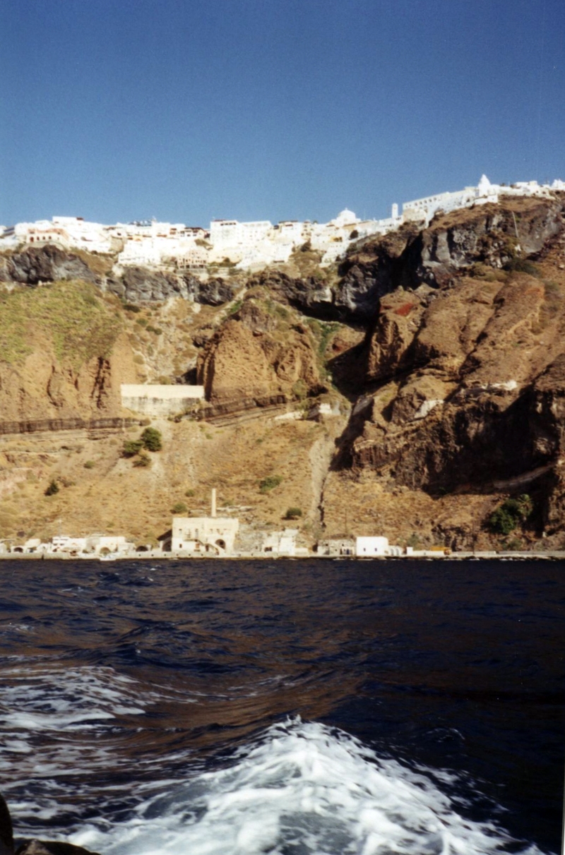 Looking down-down-down to the port of Thira. (And a lighter heading out to the Symphony.)