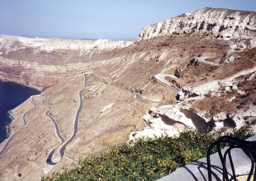 The twists and turns of the zig-zag bus track up the cliff face to the winery (from the new port, not the one below Thira town).