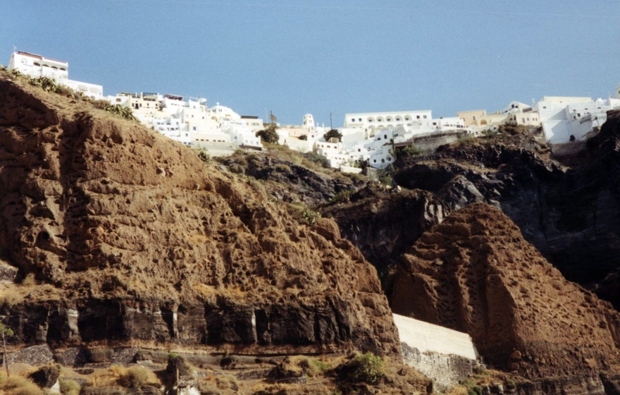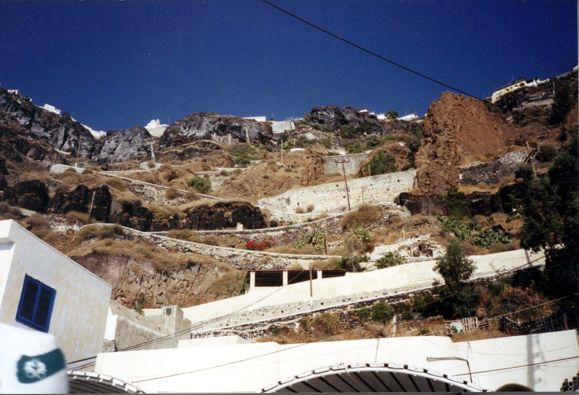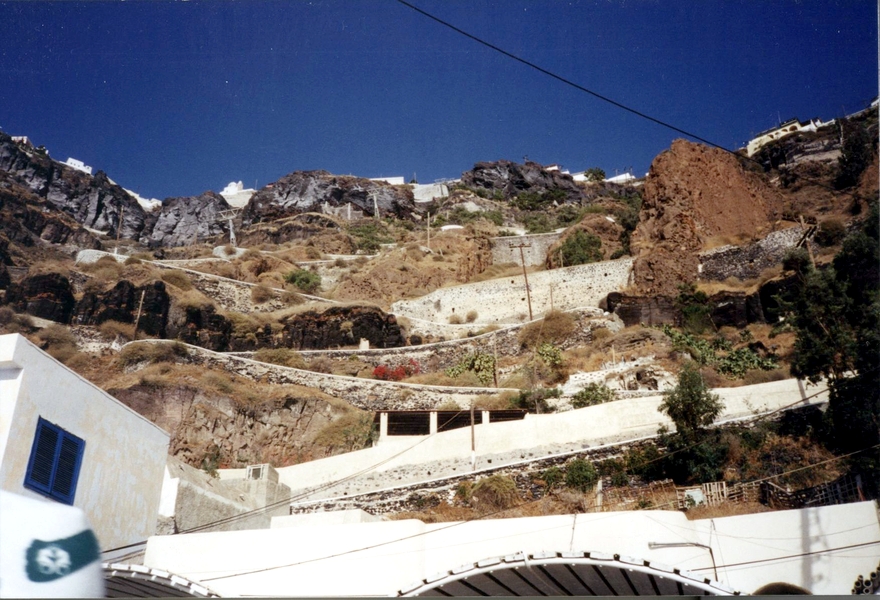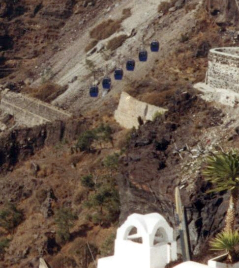 Fira/Thira sits on top of the caldera wall. You can see the donkey trail climbing up from the port. In the enlargement,y ou can see the towers of the cable car line, but the cars must be in the loading dock.