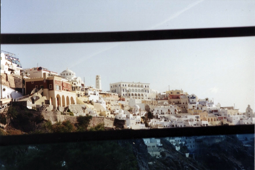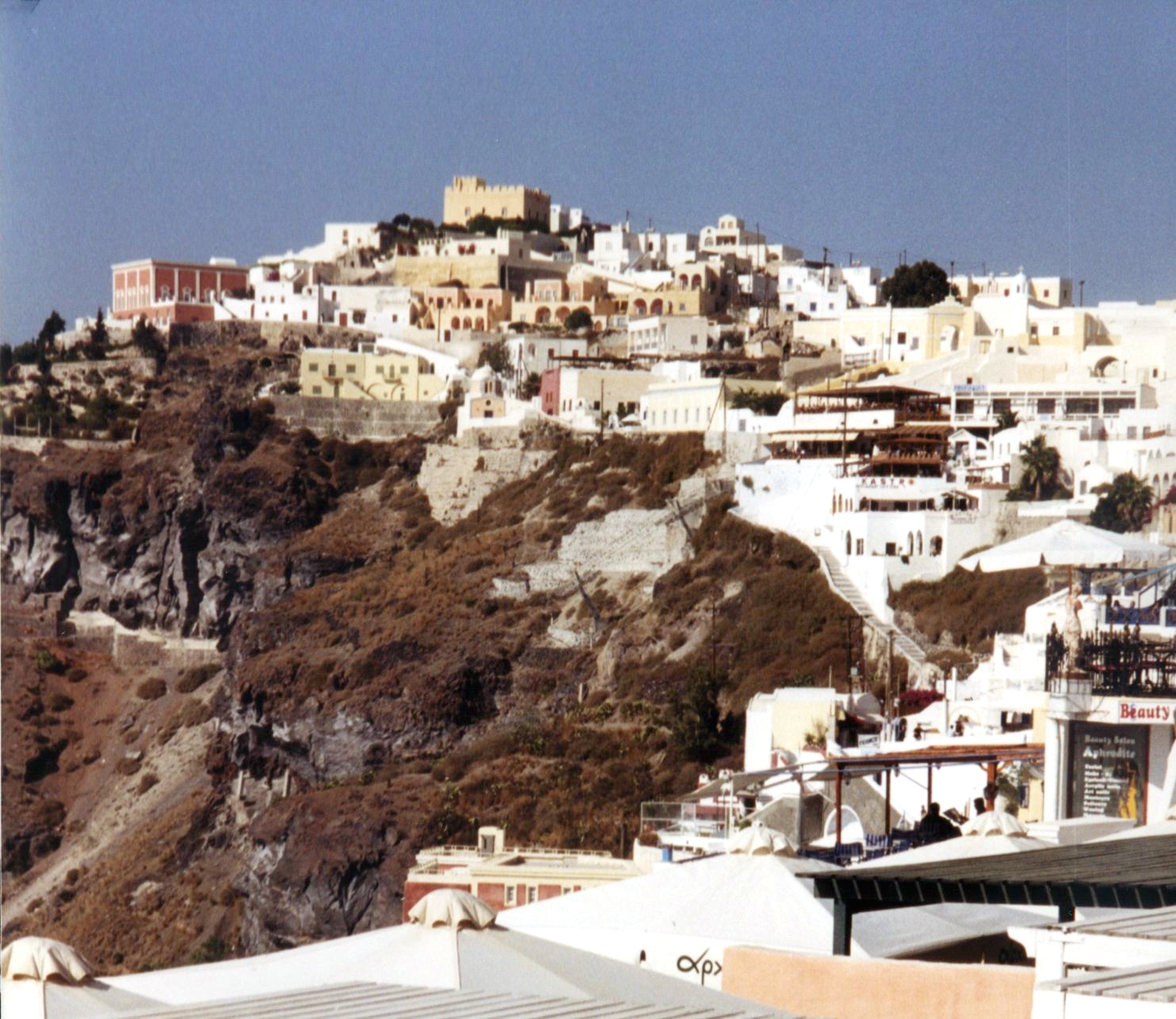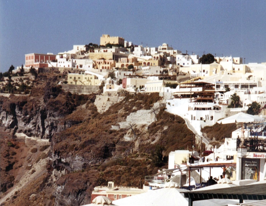 Before the volcano blew, the island was called Stroggili (“round”), from its shape. The volcano exploded around 1625 b.c. The tidal wave caused by the explosion is estimated to have been around 100 meters high. The ocean presently reaches down as much as 480 meters below sea level inside of the cliffs that are the caldera walls, which rise up as much as 300 meters above sea level. The disaster may have been the basis for Plato’s writings on the lost continent of Atlantis. The name of the town and the island are interchangeably spelled Thira and Fira (and to judge from the map below, Phira!).