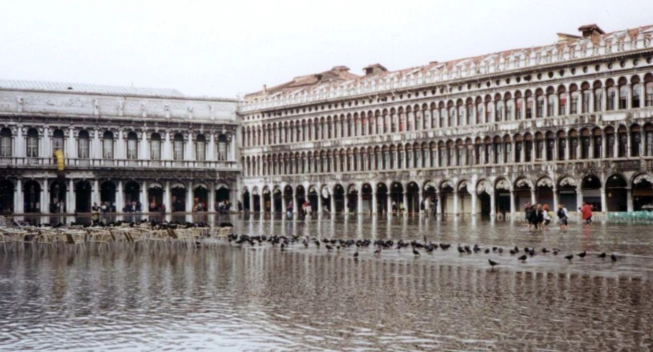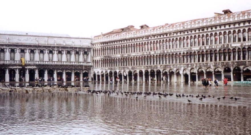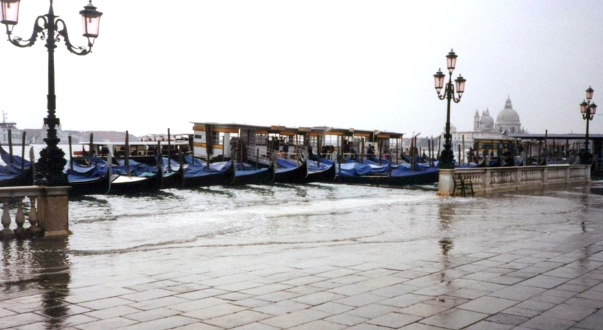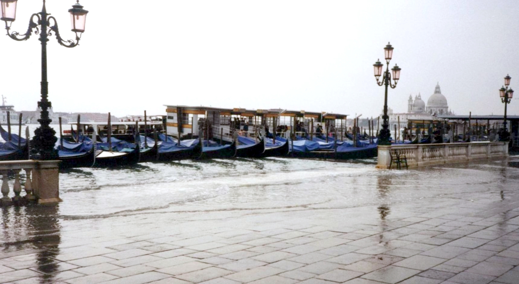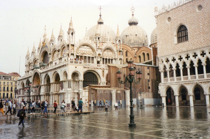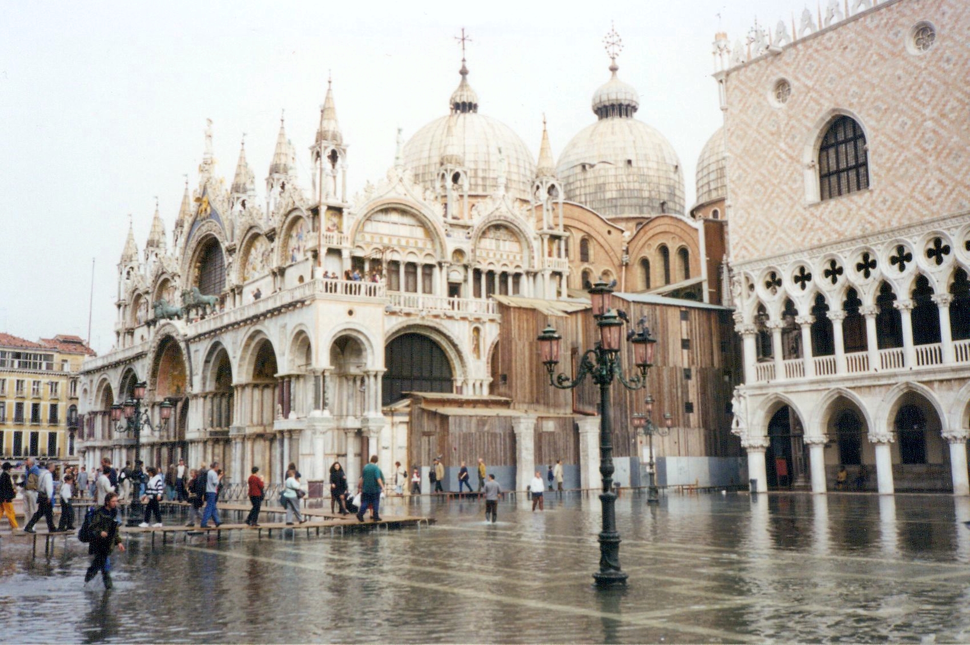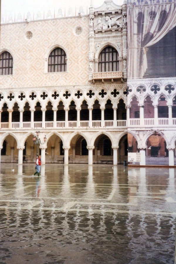 Saint Mark’s Square is innundated more and more often. We happened to be there near a full moon, so we got to see the 8″–10″ of water filling the Square.