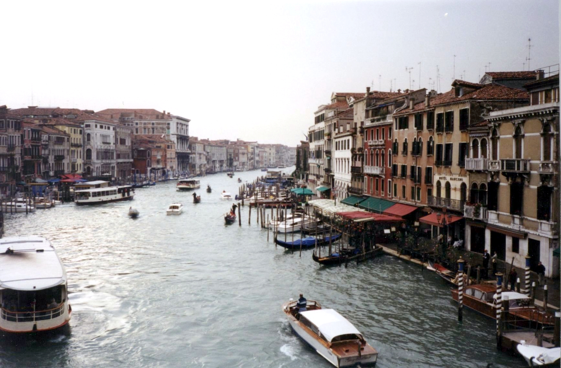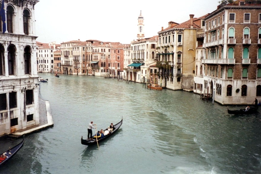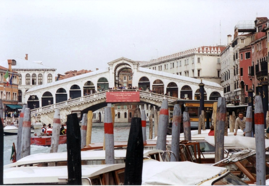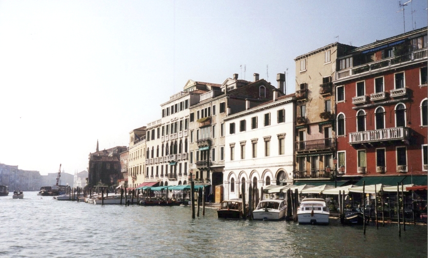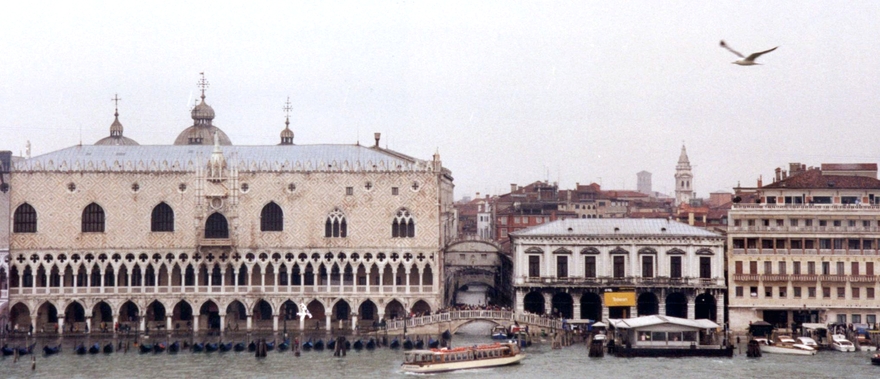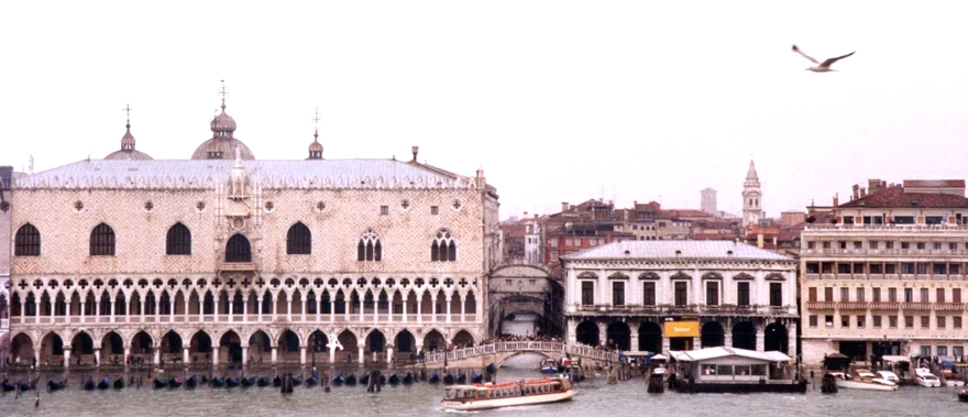 The Palazzo Ducale on the left, with the Ponte di Sospiri (Bridge of Sighs) leading to the Prigioni Nuove (the “New Prison”) on the far right. The canal is called Rio de Palazzo d. Paglia. Note the row of gondolas in front of the Palace. The red-topped boat is a vaporetto (“water-bus”); the white-roofed, glass-fronted building is the San Zaccaria (Saint Zacchary) “bus-stop.”