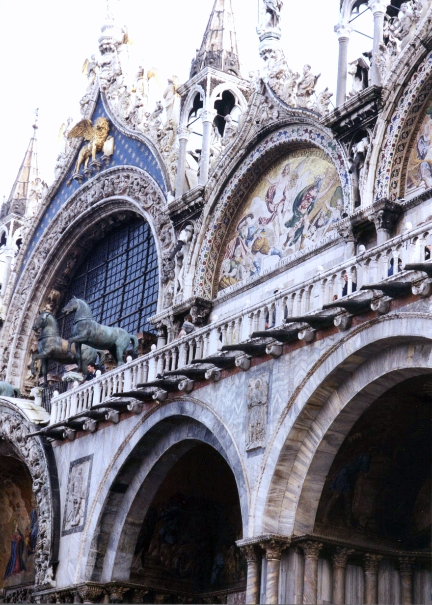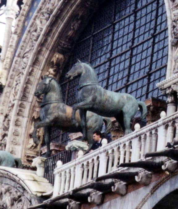 The original horses, made during the days of Alexander the Great (4th century b.c.), were taken to Rome by Nero, to Constantinople by Constantine, to Venice by crusaders, to Paris by Napoleon, and back to Venice when Napoleon fell. The four horses are replicas; the originals were taken indoors out of the acidic air.