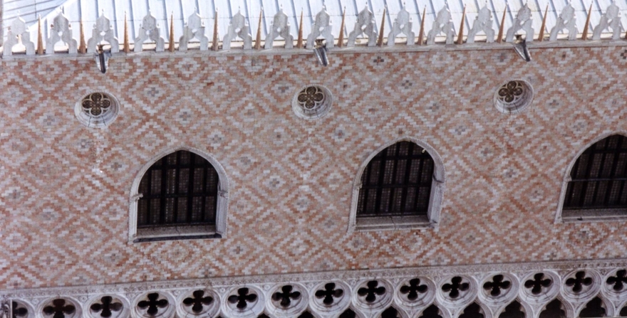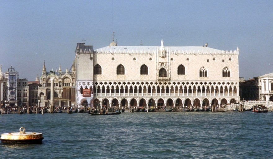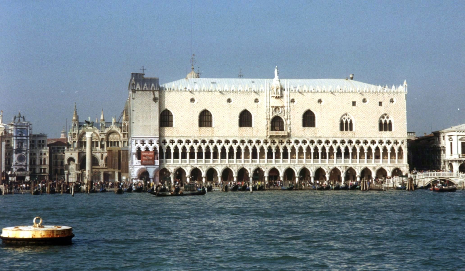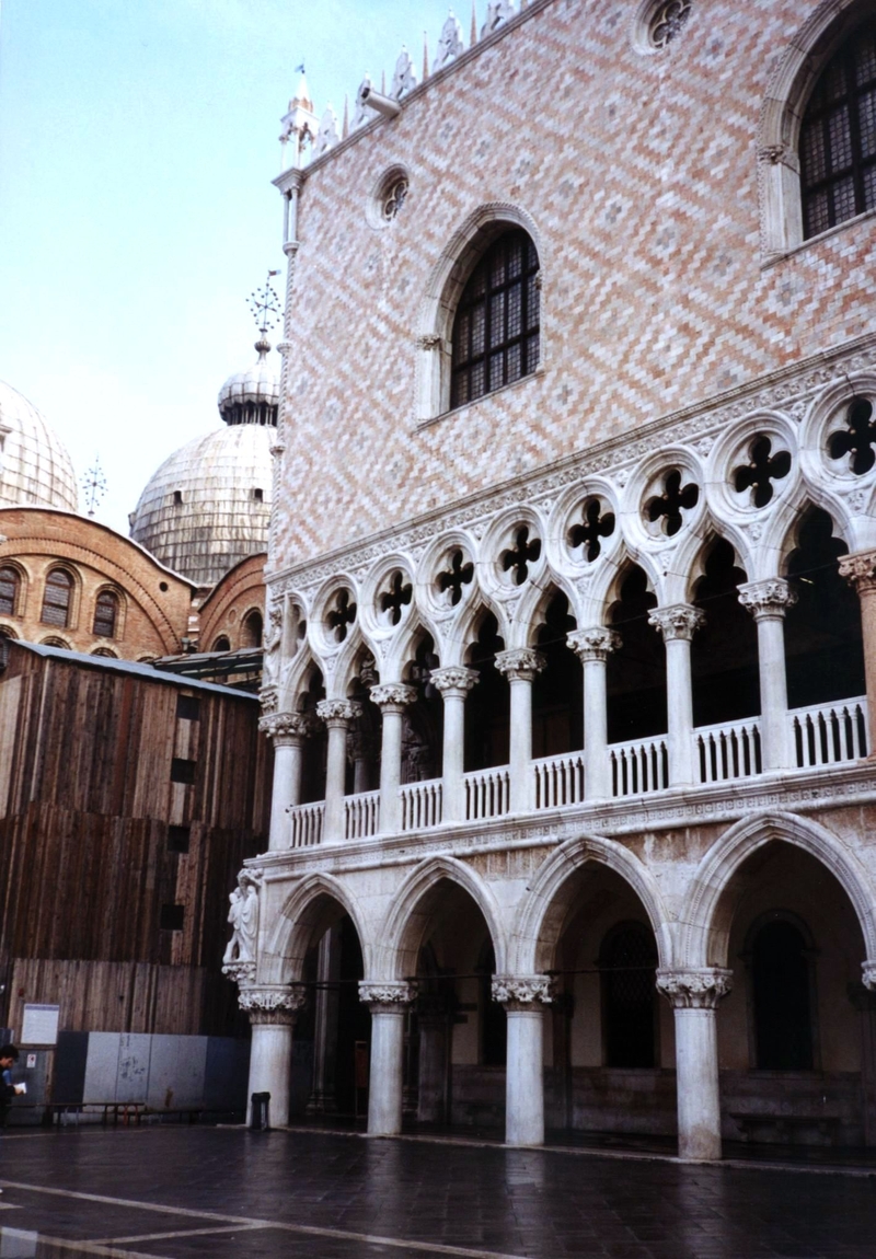 The front of the Palazzo Ducale. The present building (c.1345–1438) is considered a definitive example of Venetian Gothic architecture.