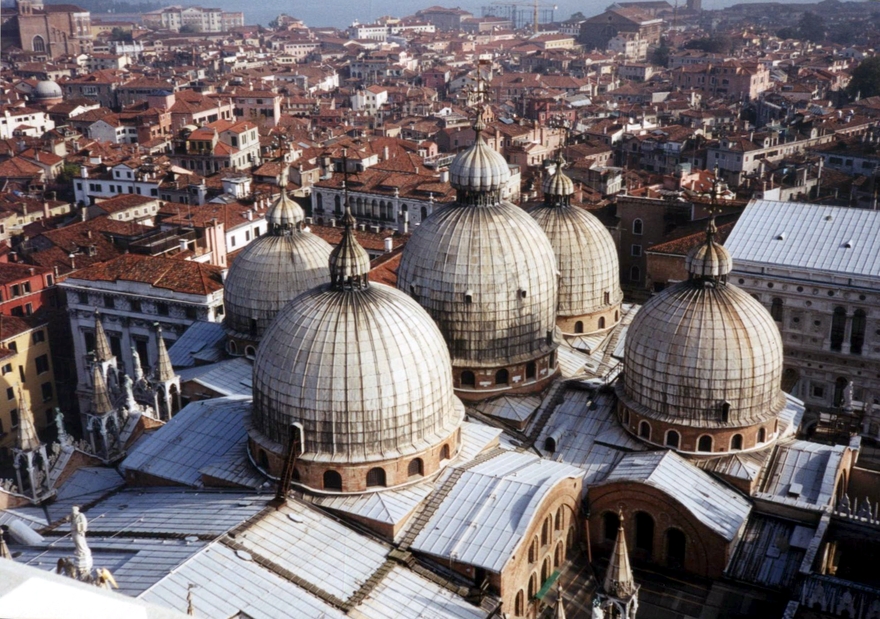 The Basilica di San Marco from up in the Campanile. The church is built in the shape of