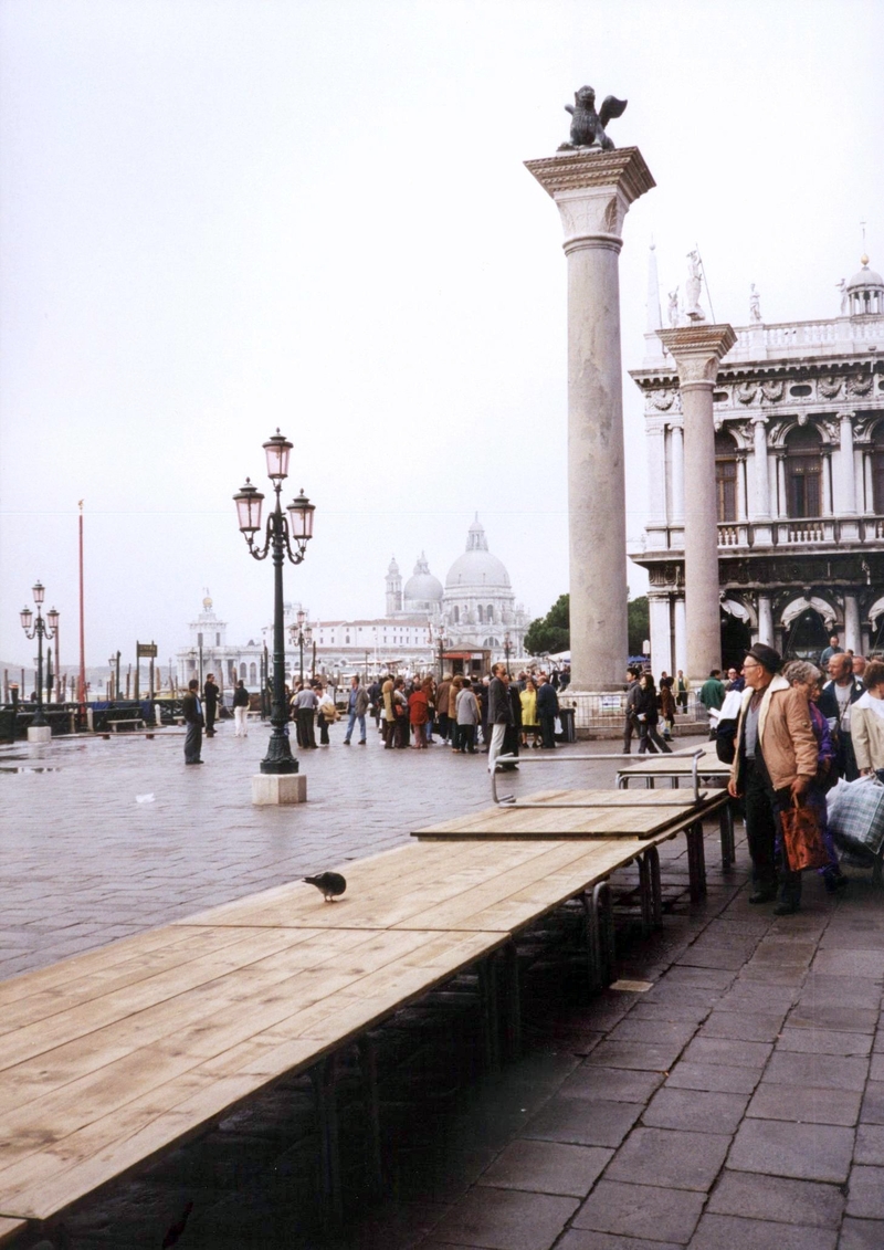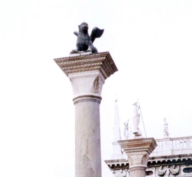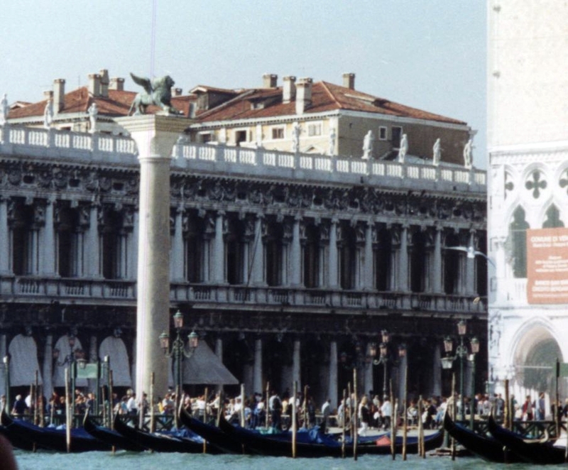 Looking into the Piazza: The Colonne de Marco E Todaro (Columns of Mark and Theodore), erected in 1180 at the entrance to the Piazza San Marco. The left one is Saint Theodore of Studium on a crocodile (Todaro in dialect, the first patron of Venice); to the right is the winged lion of Saint Mark (present patron of Venice). This lion is controversial as the book (the Bible) lies open but the front feet of the lion rest on it, indicating that the lion/Venice will not accept the dominance of the church: Venice was excommunicated at least twice by the Popes.