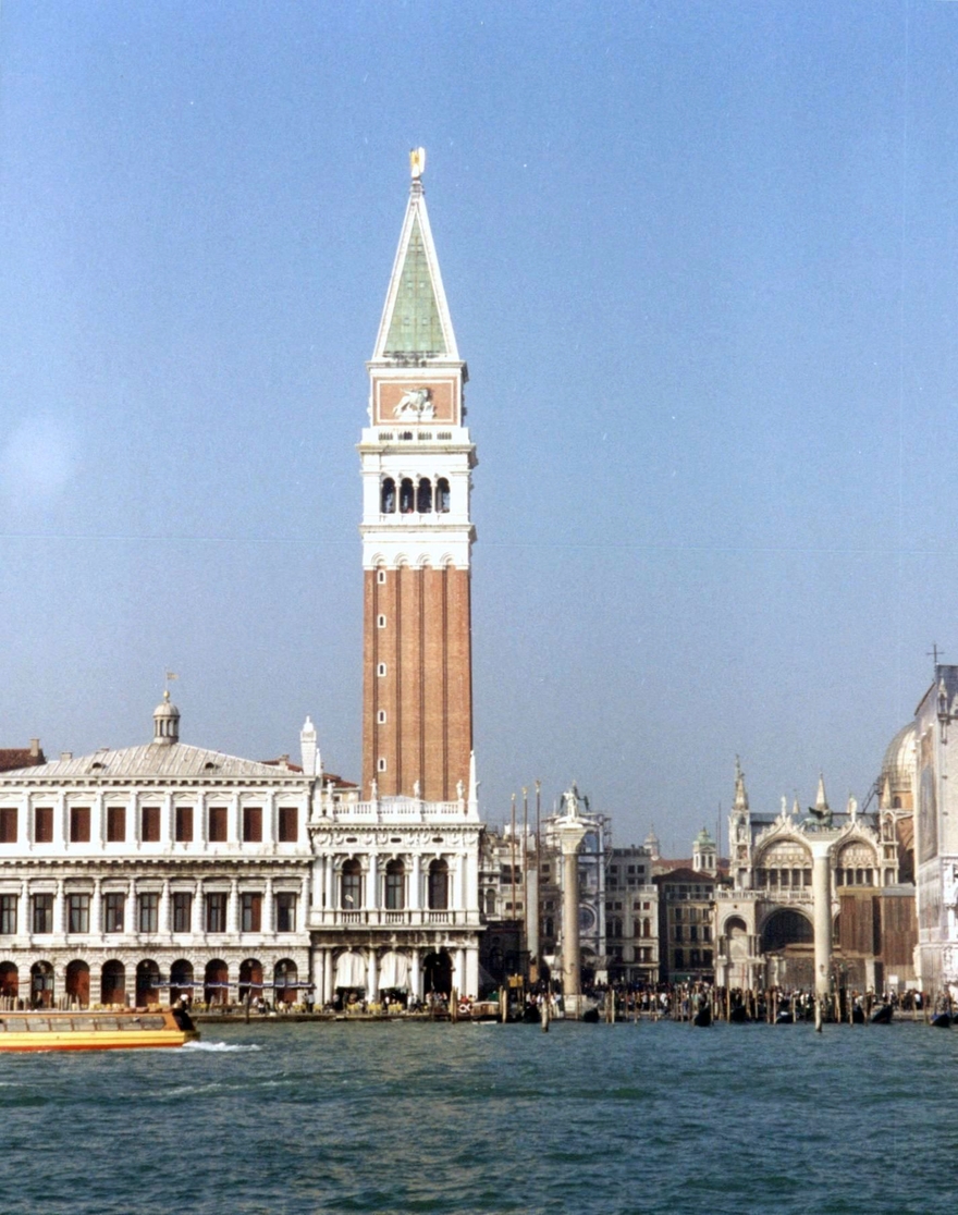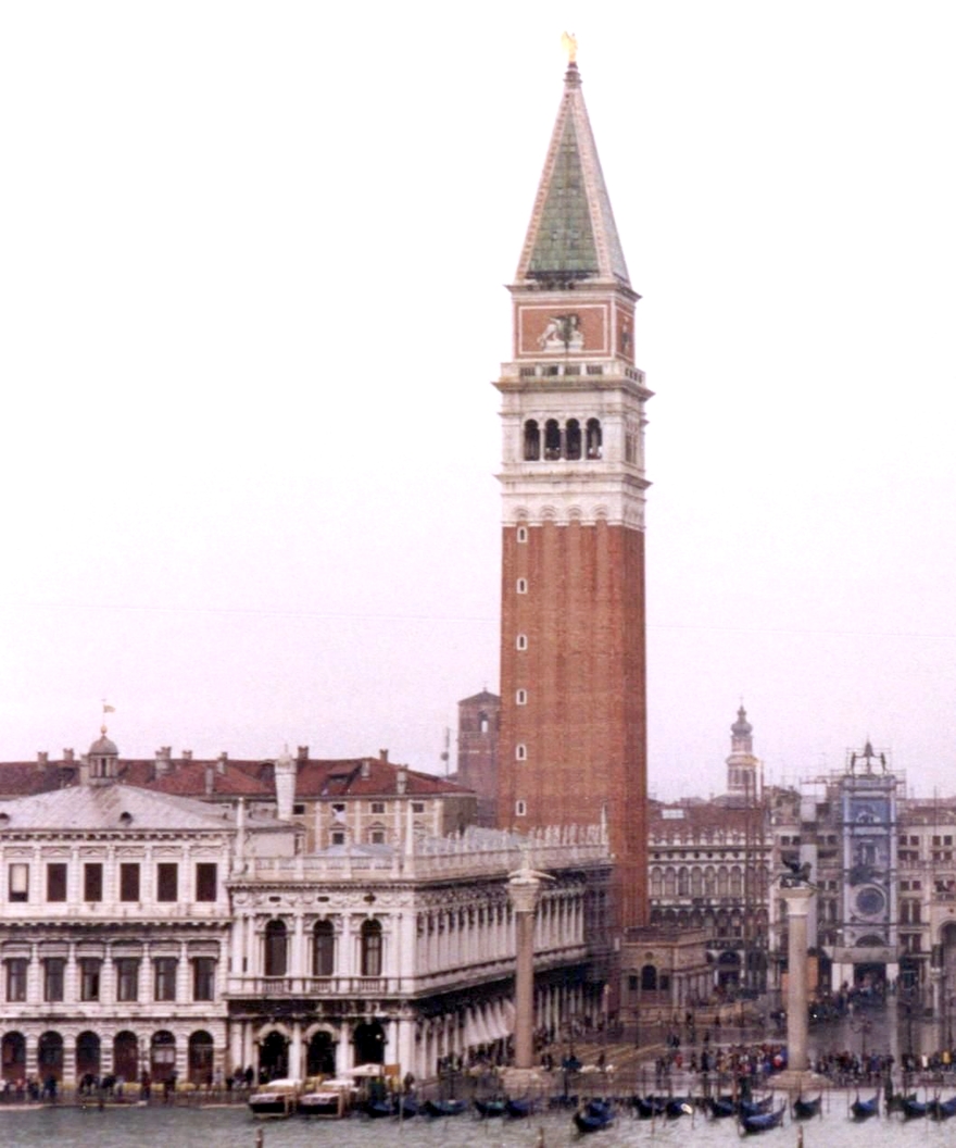 The Campanile (clock tower) was built between 874–1150 a.d. and reconstructed after it collapsed in 1902. The building to the left front of the Campanile is the Biblioteca Marciana. The Ducal Palace (Palazzo Ducale) is in the center, at the right of the entrance to the Piazza San Marco. The “New Prison” (Prigioni Nuove) is just visible to the far right.