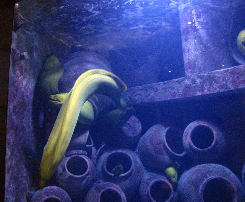 Moray Eel Exhibit This storage room for Atlantean pots and urns has become the perfect home for green moray eels Gymnothorax funebris. Eels are actually fish. The green color of these animals is produced by a yellow mucous layer, which overlays the darker blue skin. They grow to an impressive length of 6 ft.