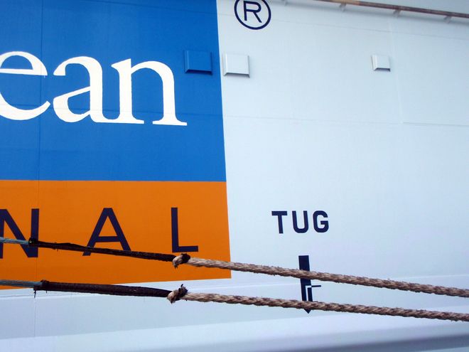 The dredge blocks part of the view from the ferry on our trip to the America’s Cup racing ship