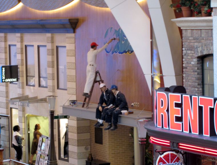 The (fake) guy, with his fake friends, painting over the Genesis graphitti are a joke about
