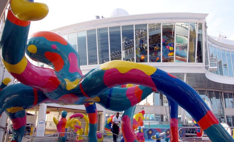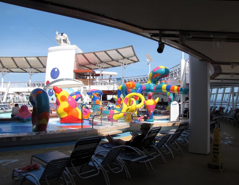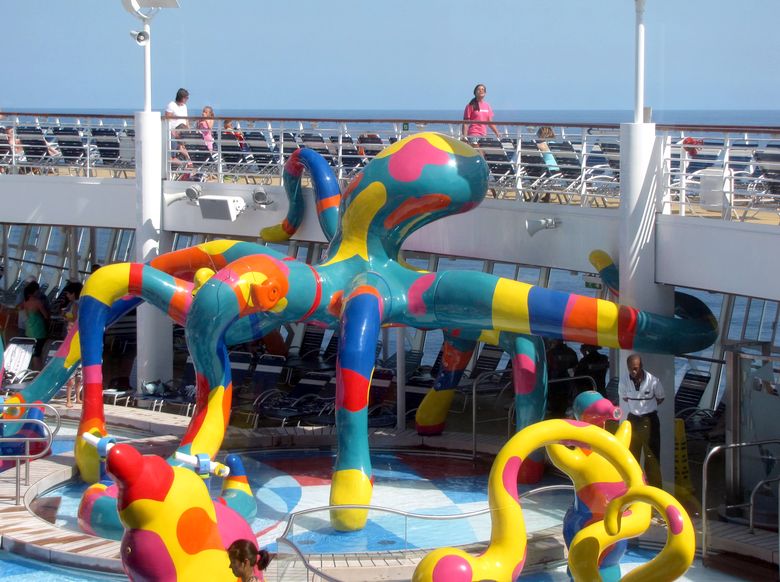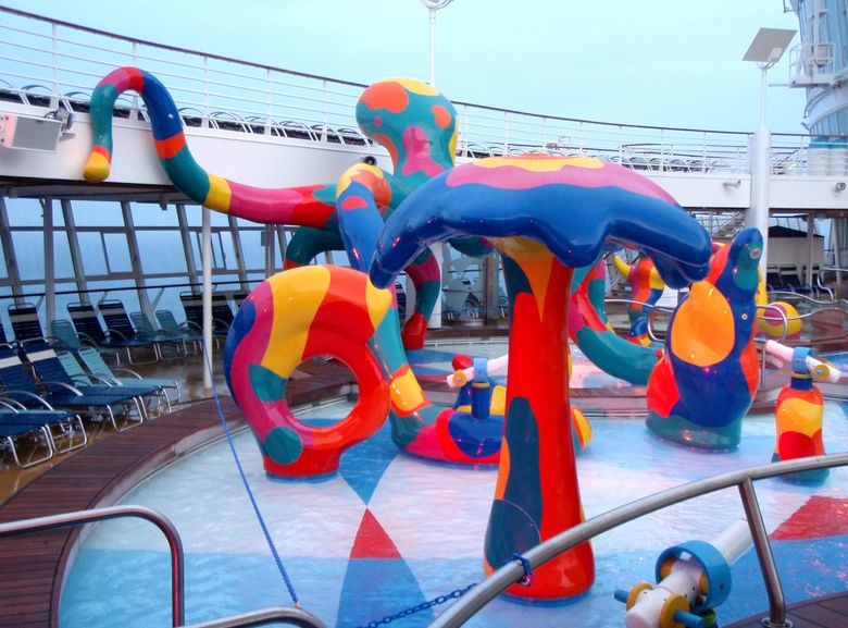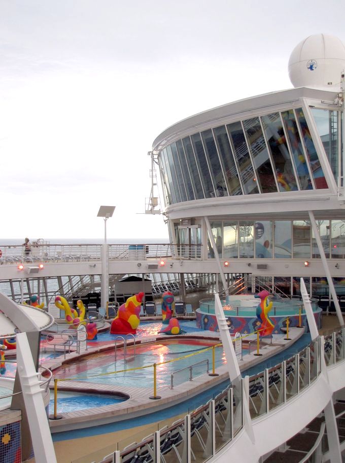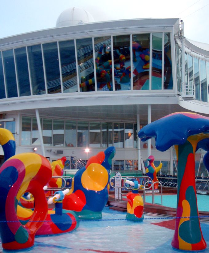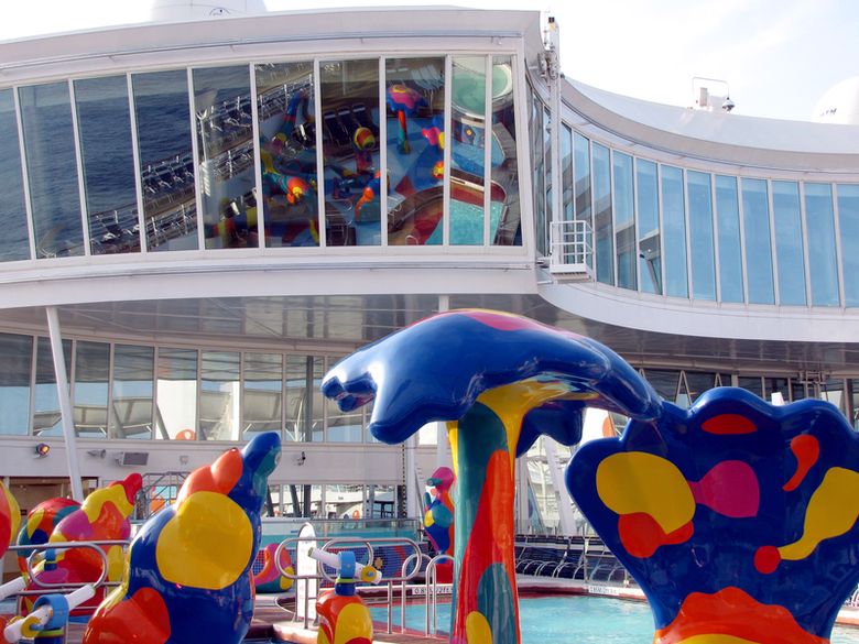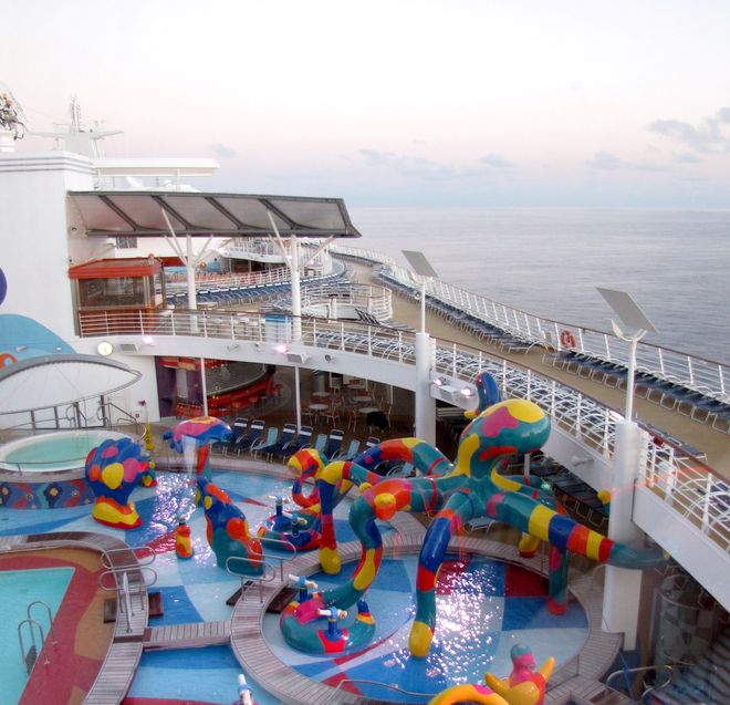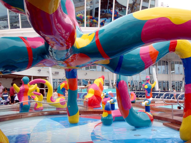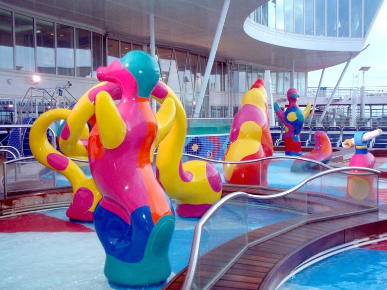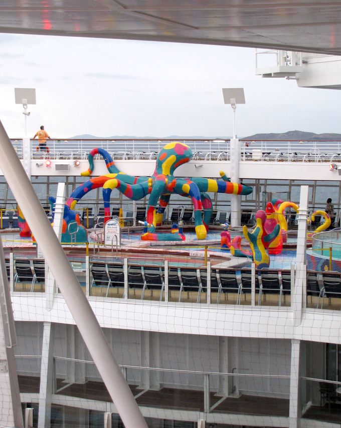 Families looking for fun in the sun will easily spot Royal Caribbean’s signature H2O Zone, marked by a giant octopus with its slides and water-spraying tentacles and surrounded by fellow water-spouting ocean creatures. Separate wading and current pools, as well as a dedicated infant and toddler pool, are set in the interactive aquatic playground and surrounded by adult and child-sized lounge chairs.