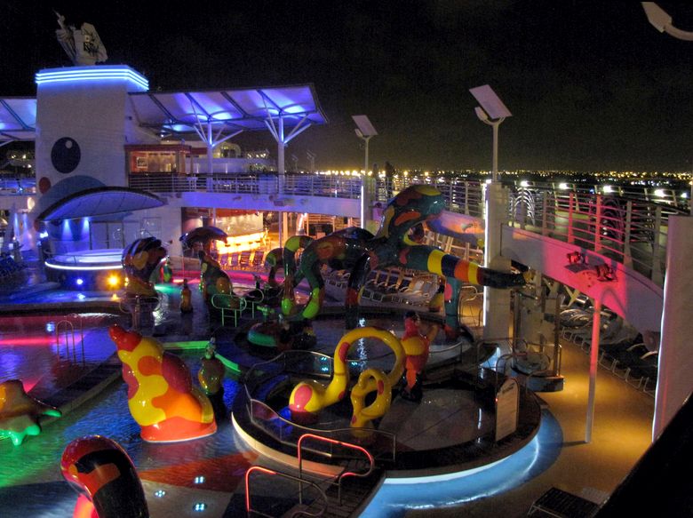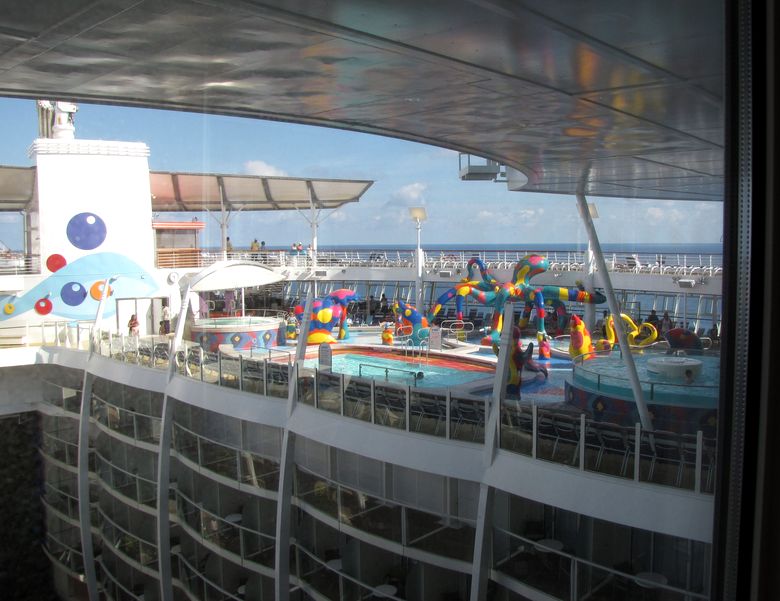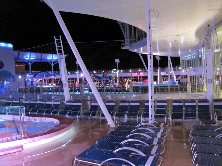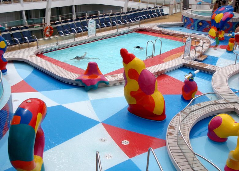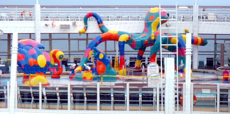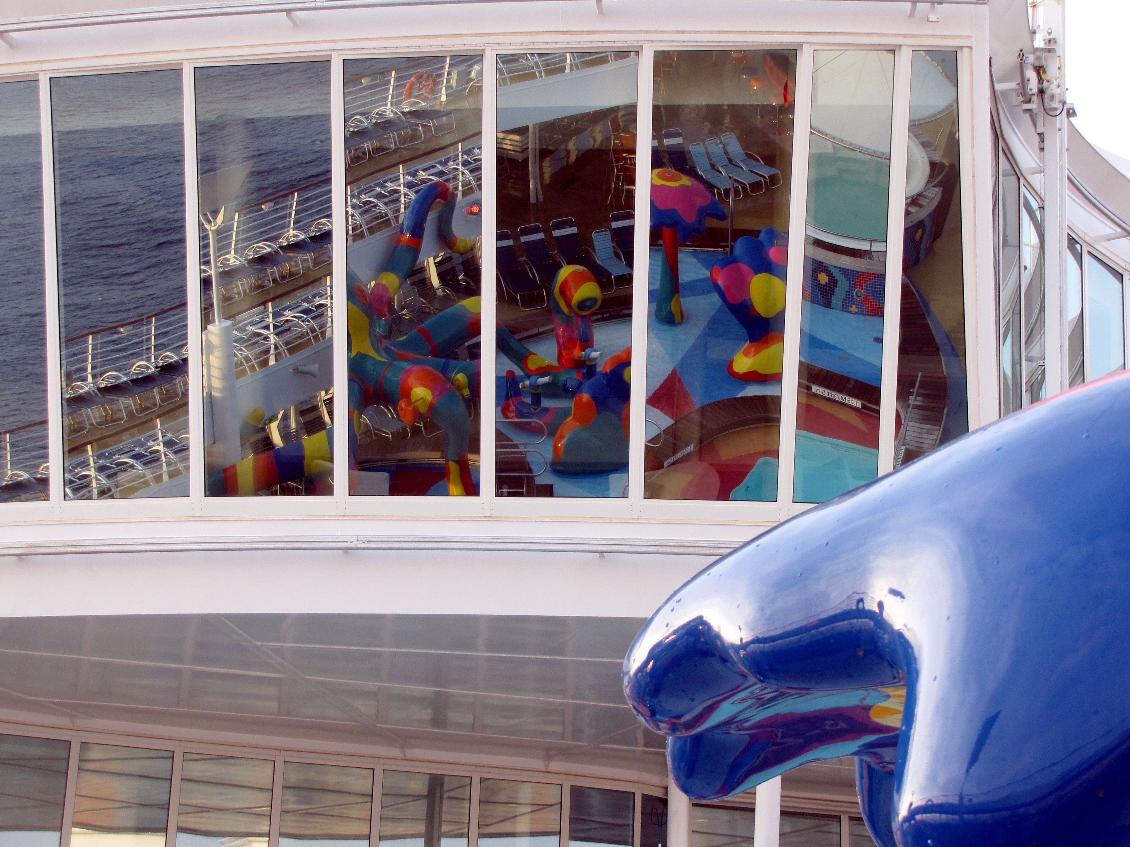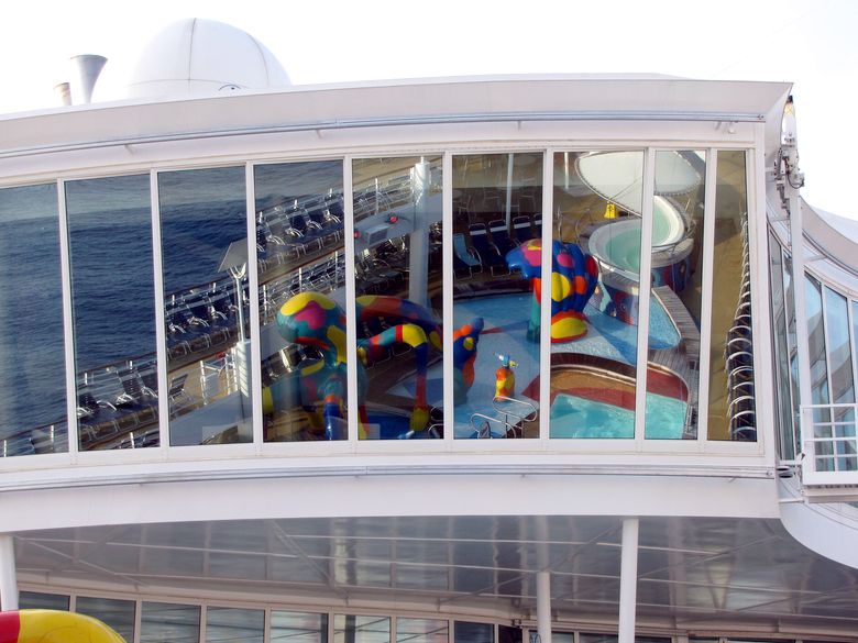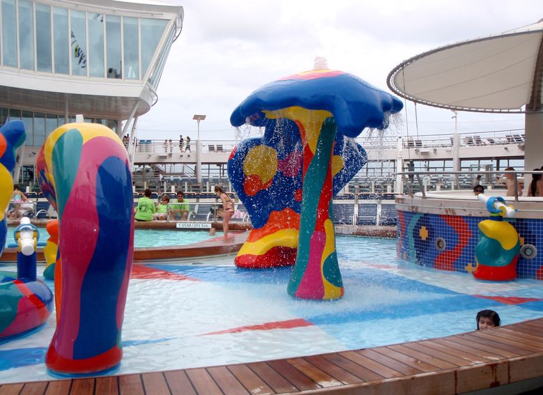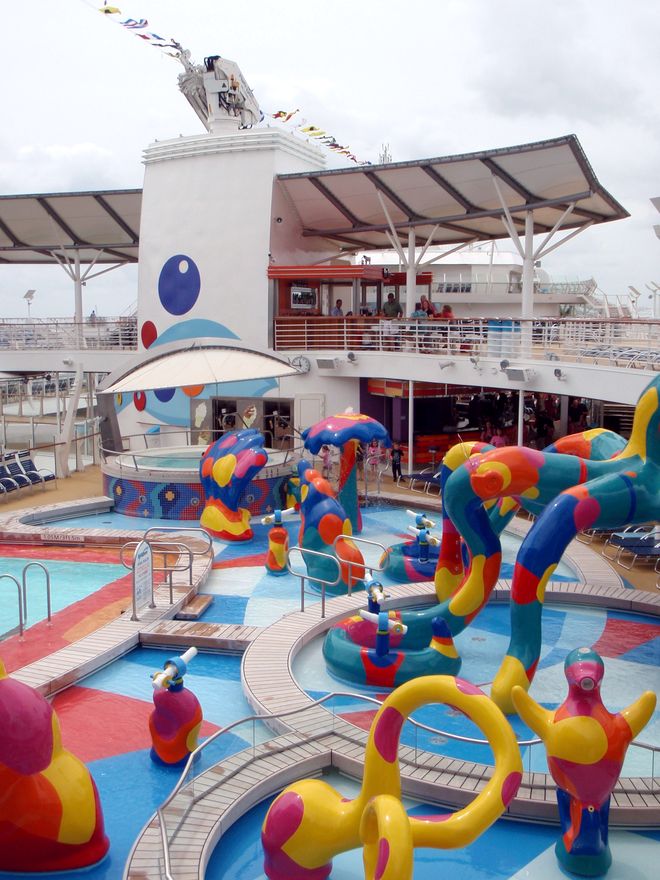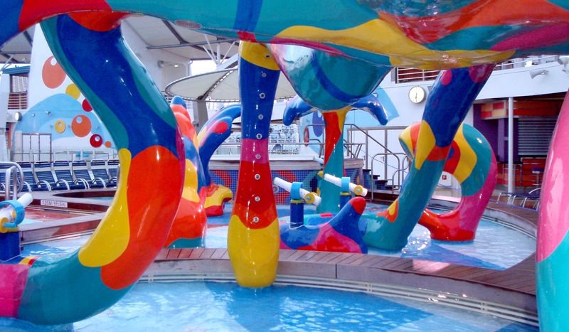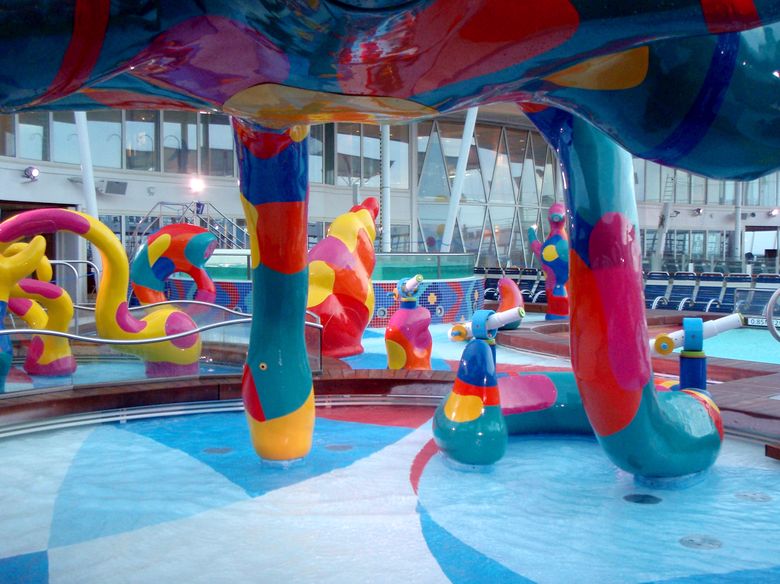 Families looking for fun in the sun will easily spot Royal Caribbean’s signature H2O Zone, marked by a giant octopus with its slides and water-spraying tentacles and surrounded by fellow water-spouting ocean creatures. Separate wading and current pools, as well as a dedicated infant and toddler pool, are set in the interactive aquatic playground and surrounded by adult and child-sized lounge chairs.