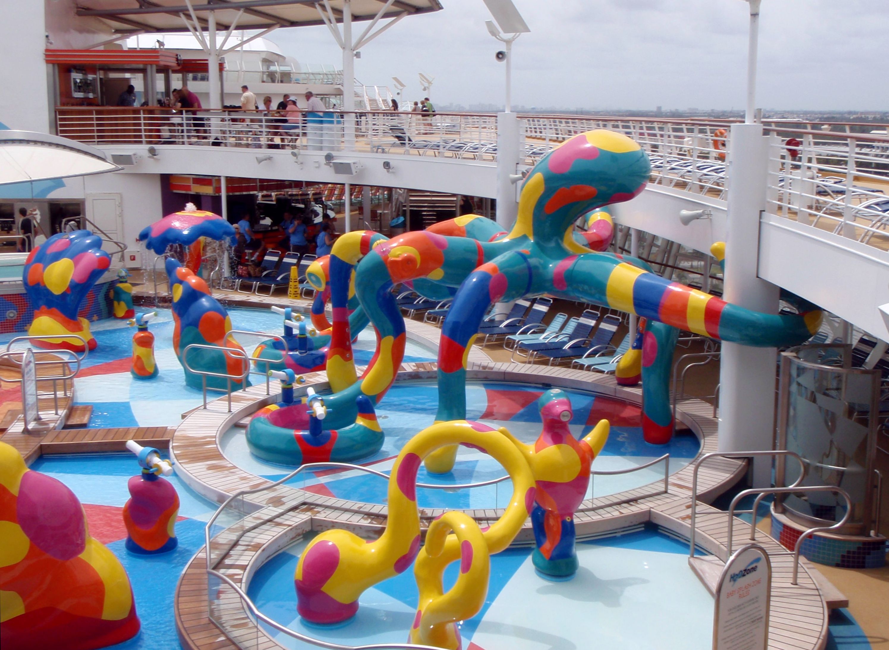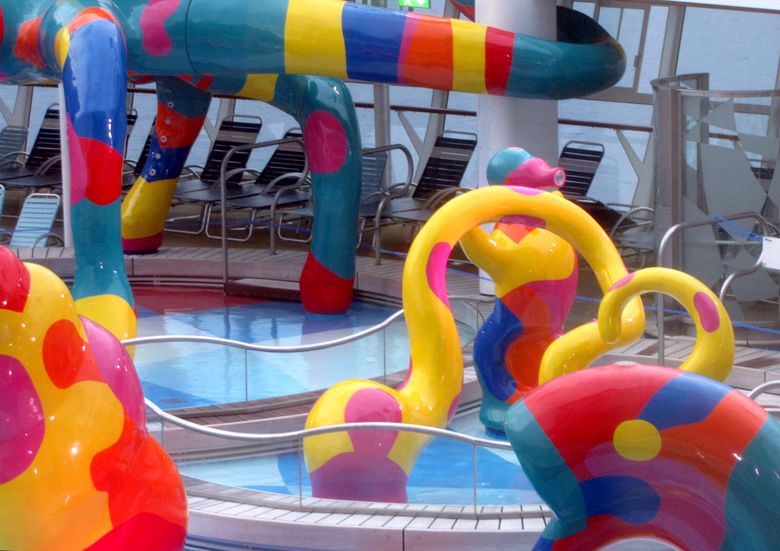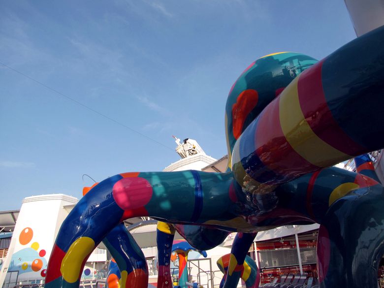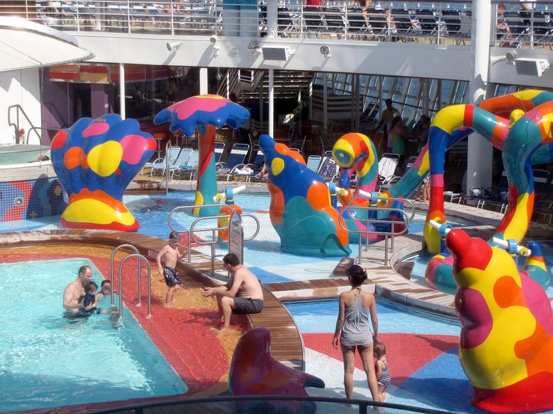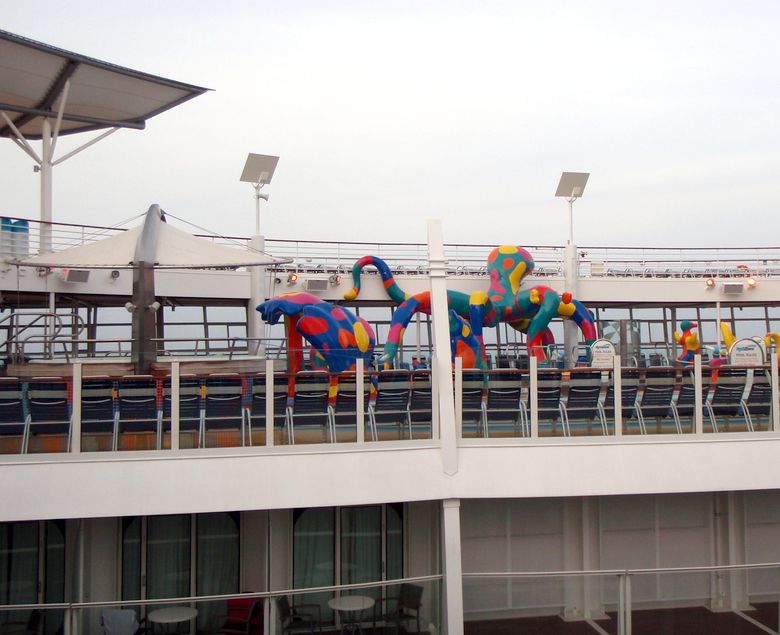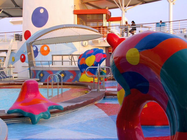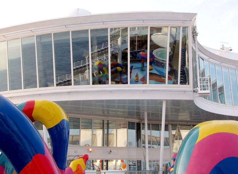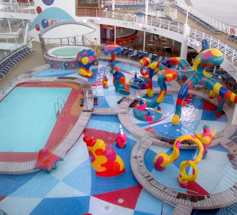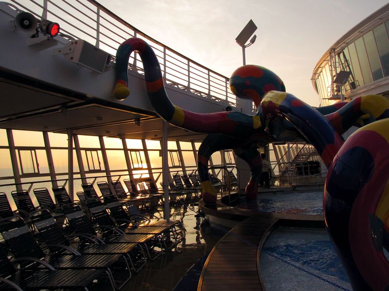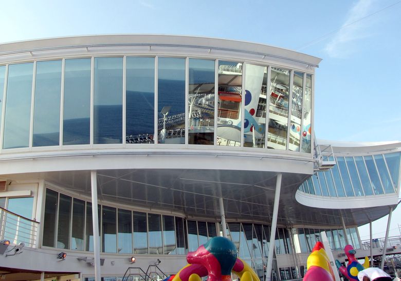 Families looking for fun in the sun will easily spot Royal Caribbean’s signature H2O Zone, marked by a giant octopus with its slides and water-spraying tentacles and surrounded by fellow water-spouting ocean creatures. Separate wading and current pools, as well as a dedicated infant and toddler pool, are set in the interactive aquatic playground and surrounded by adult and child-sized lounge chairs.