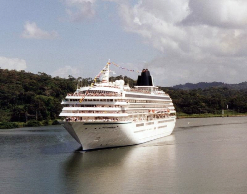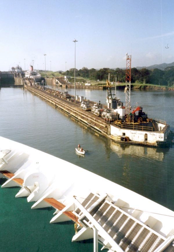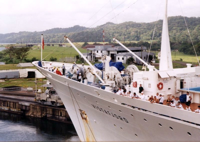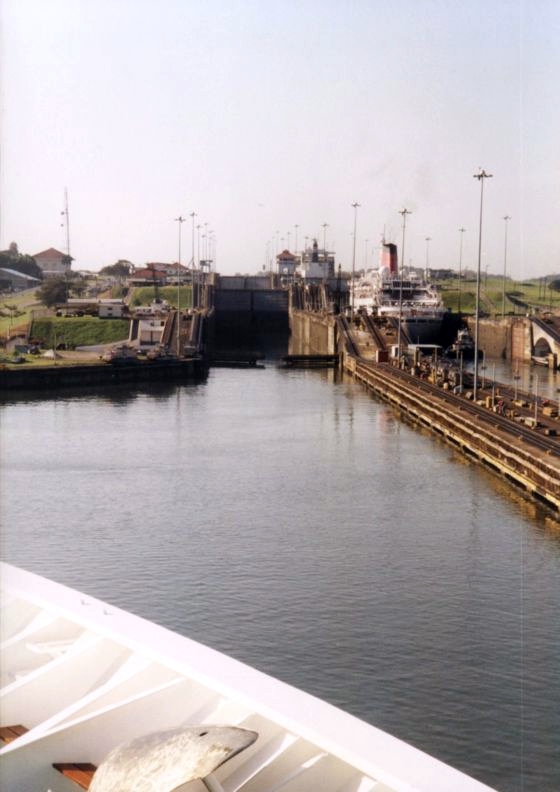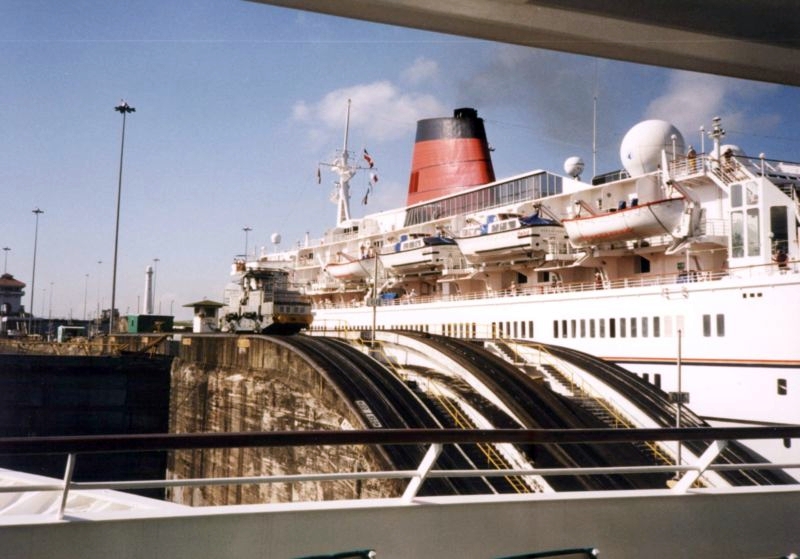 The Cunard Vistafjord enters the right-hand lock, as the Symphony entered the left-hand lock.