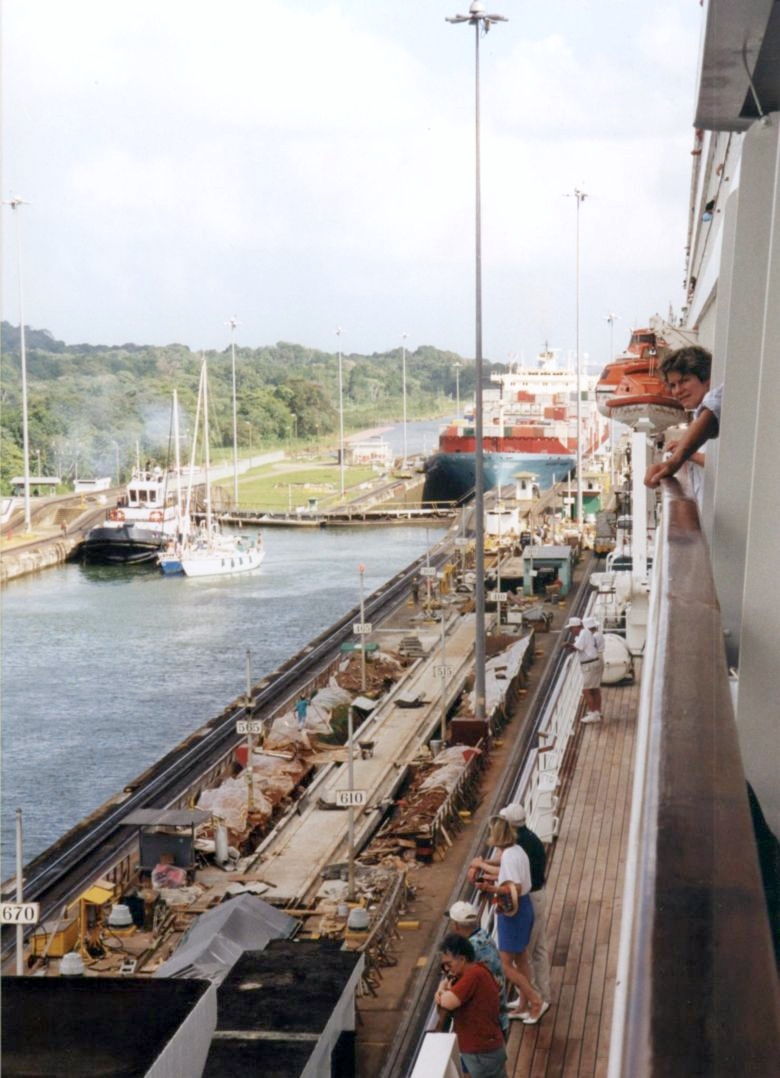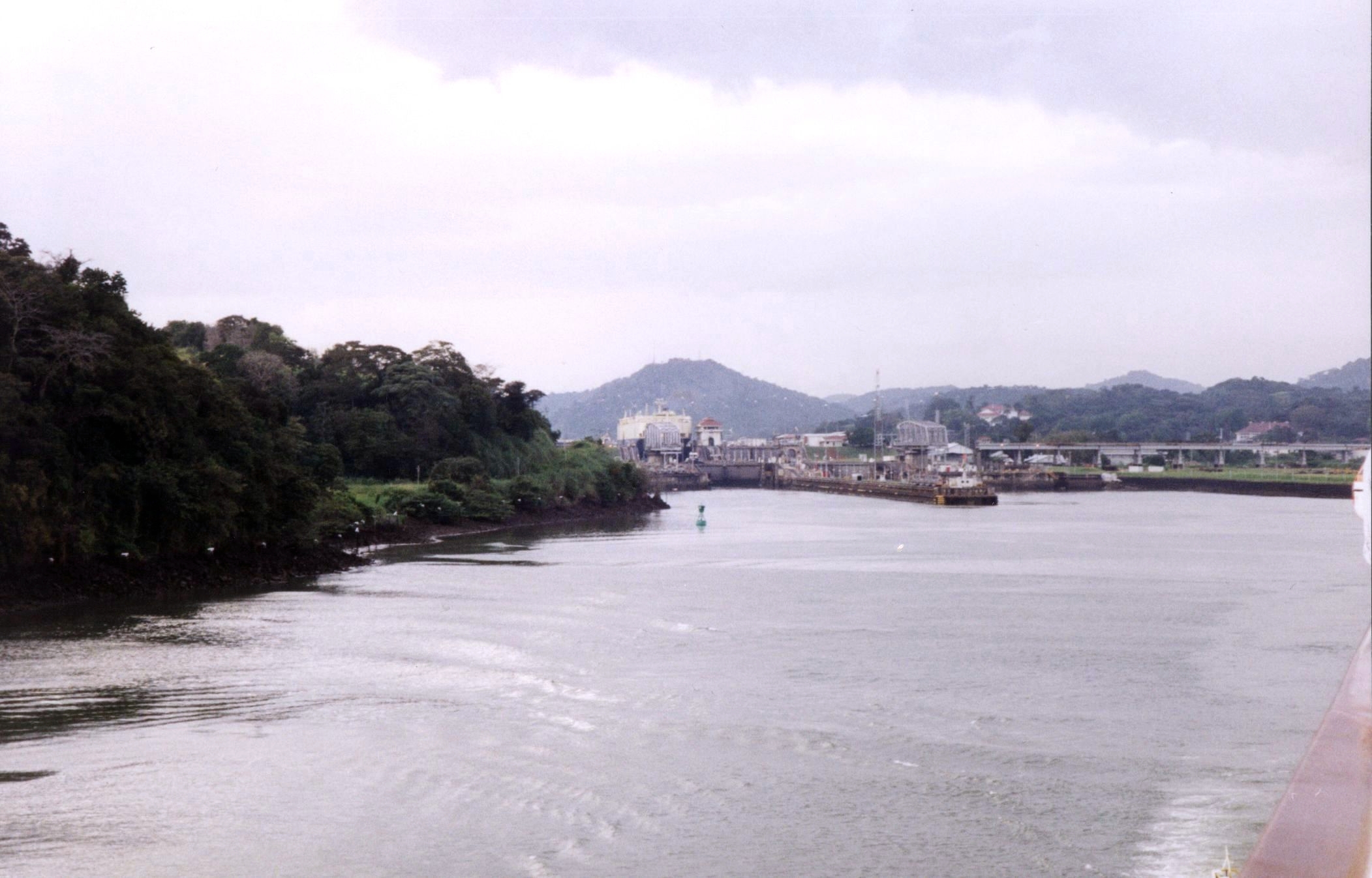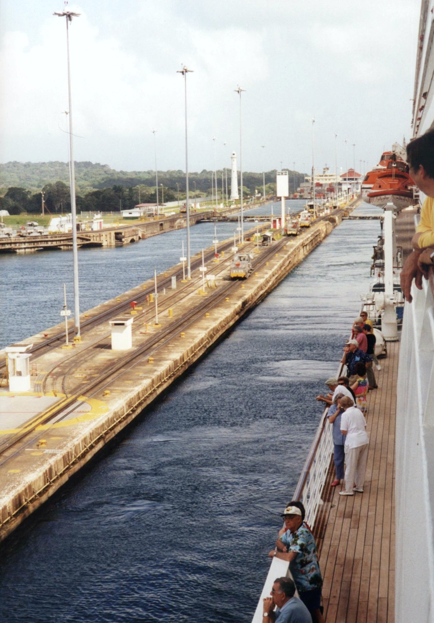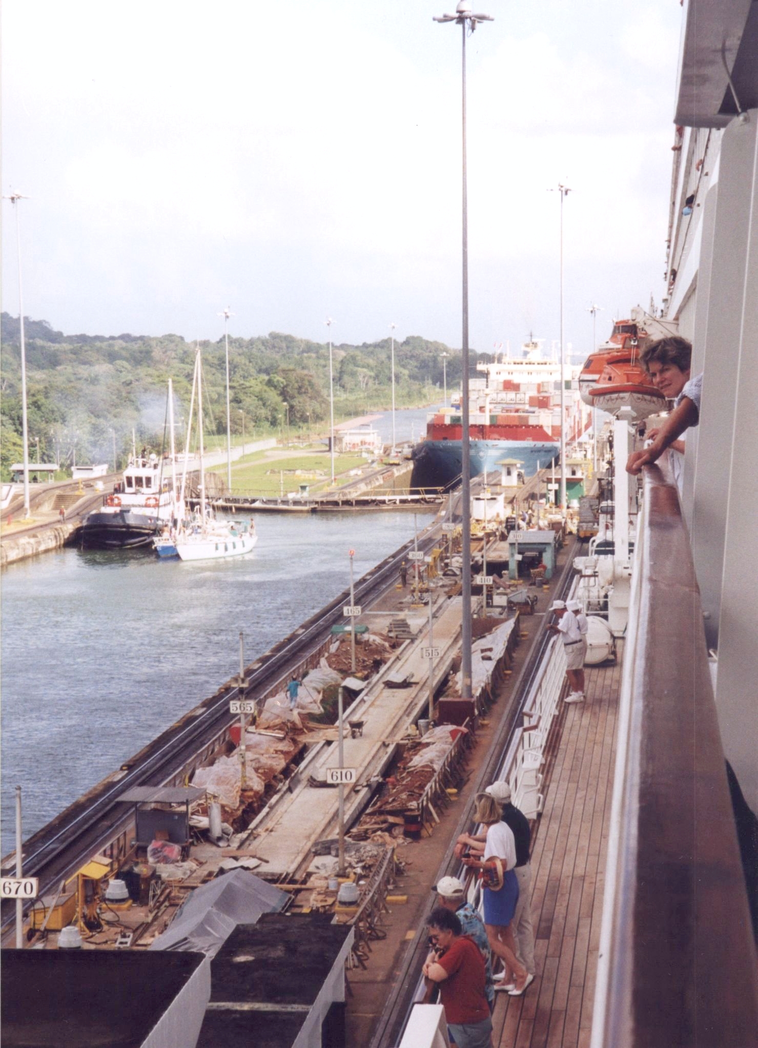 It cost the Crystal Symphony $111,000 in tolls (in 1999 dollars) to go through the Canal. I didn’t take a picture, but at the Atlantic side were easily 25–30 ships anchored, waiting their turn to enter the locks. The cruise ships pay a (“small”) surcharge to get in when they arrive. It’s not cost-effective for cargo ships to pay extra, so they anchor and wait their turn.