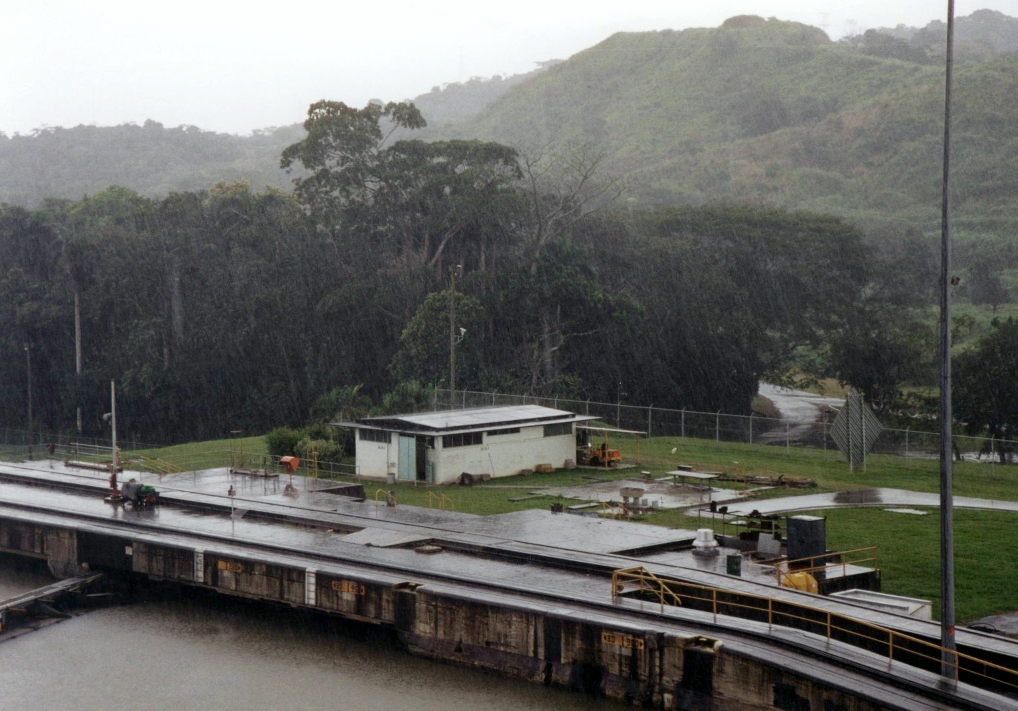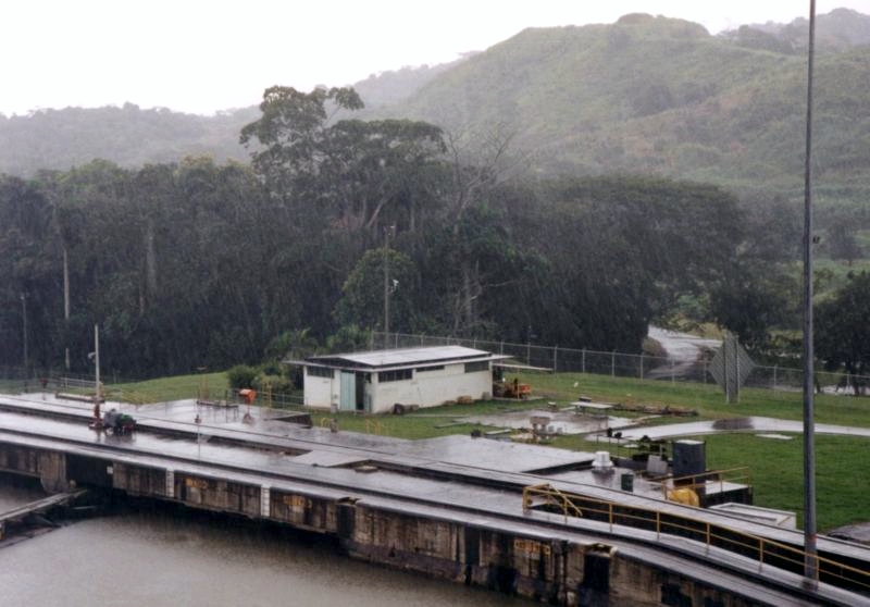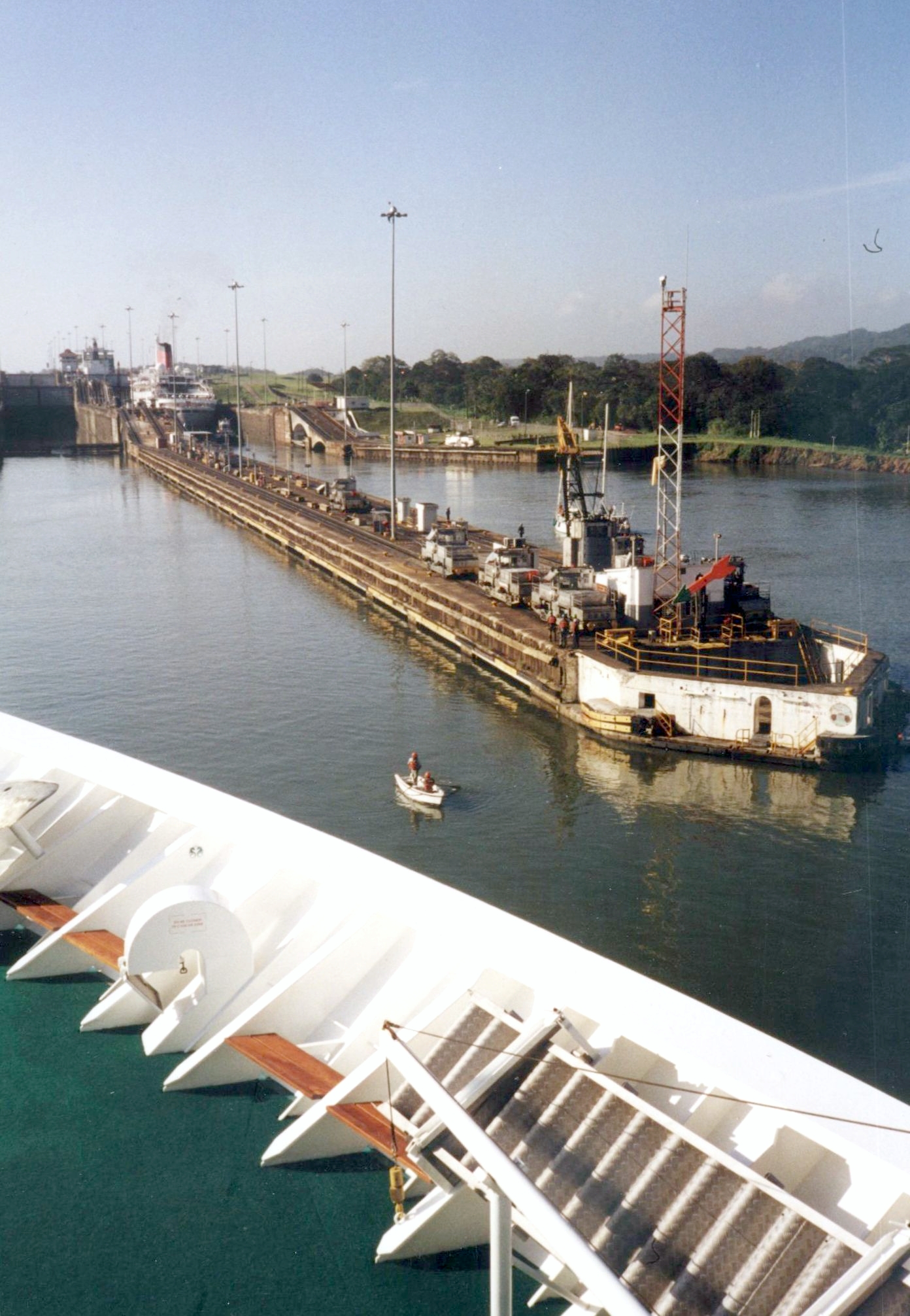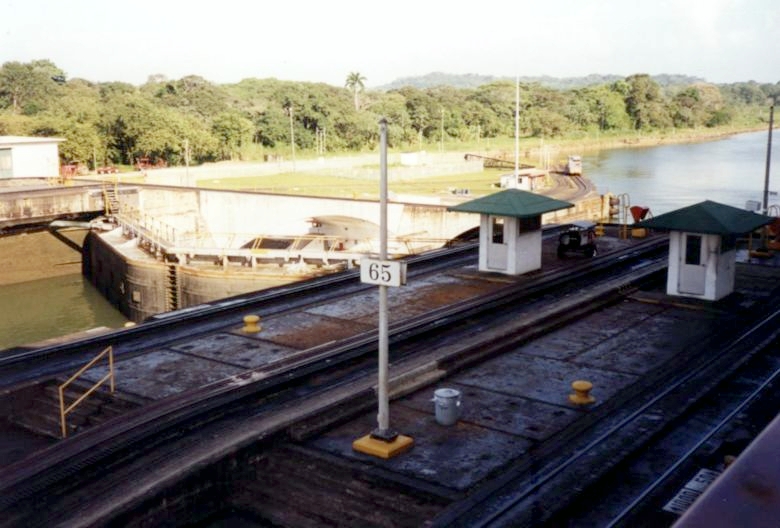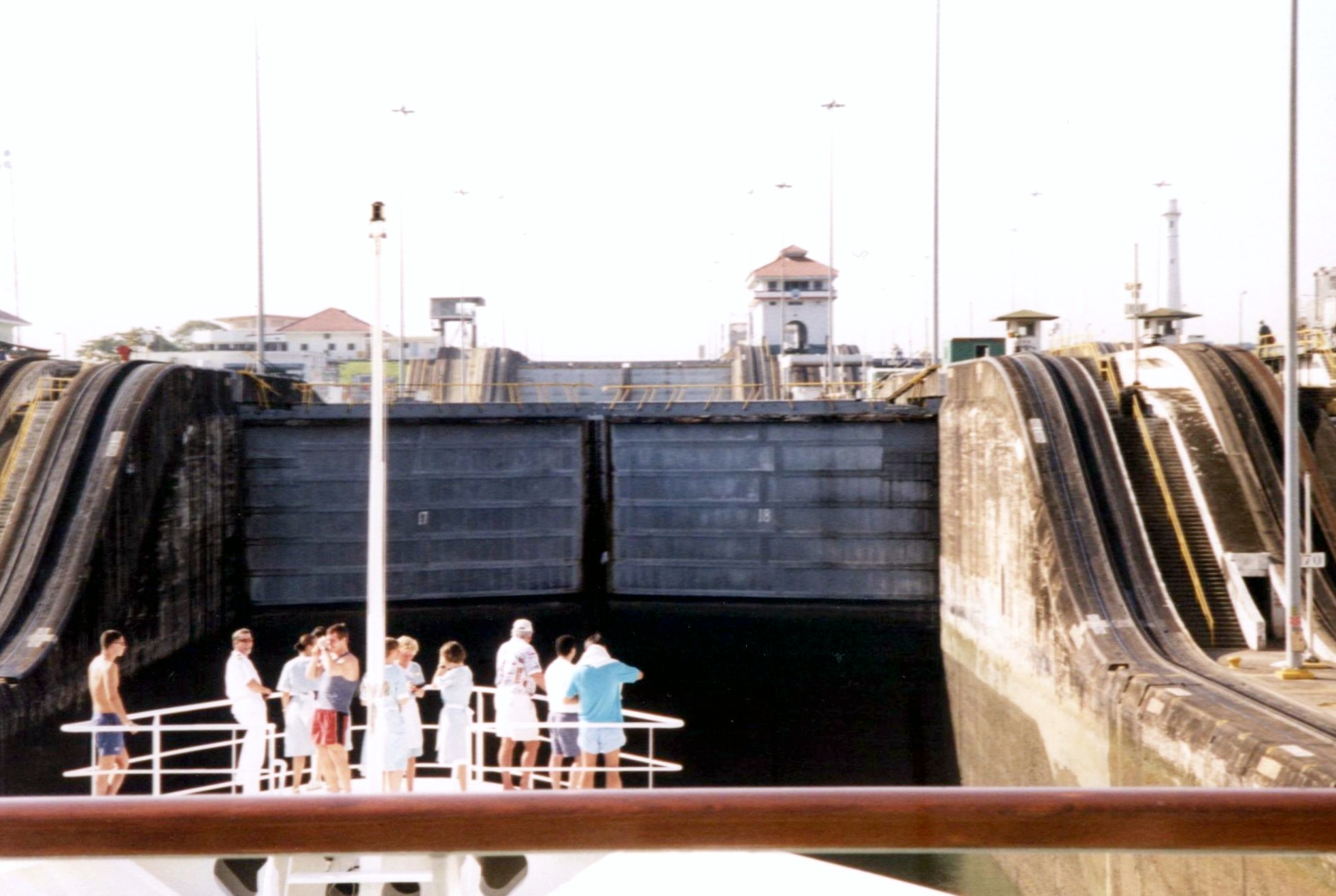 It cost the Crystal Symphony $111,000 in tolls (in 1999 dollars) to go through the Canal. I didn’t take a picture, but at the Atlantic side were easily 25–30 ships anchored, waiting their turn to enter the locks. The cruise ships pay a (“small”) surcharge to get in when they arrive. It’s not cost-effective for cargo ships to pay extra, so they anchor and wait their turn.
