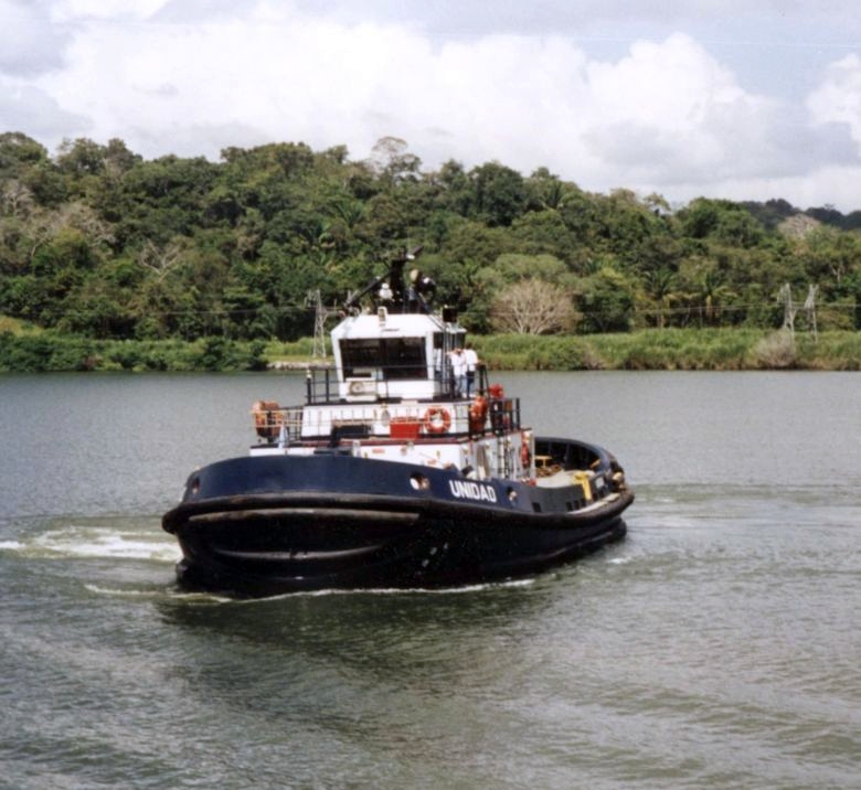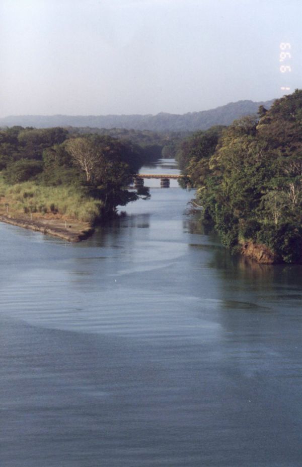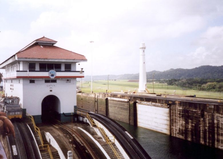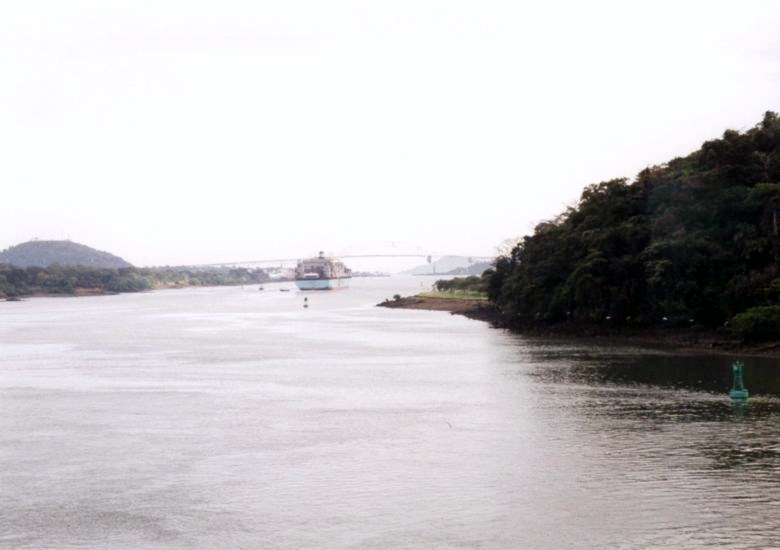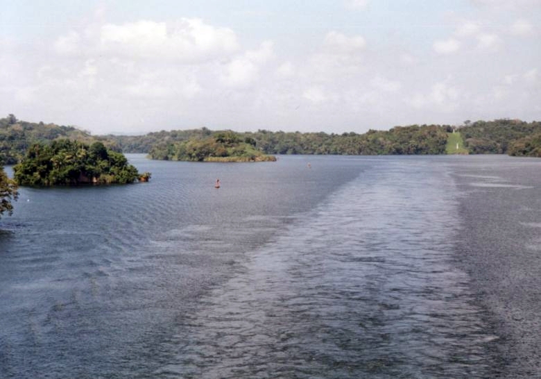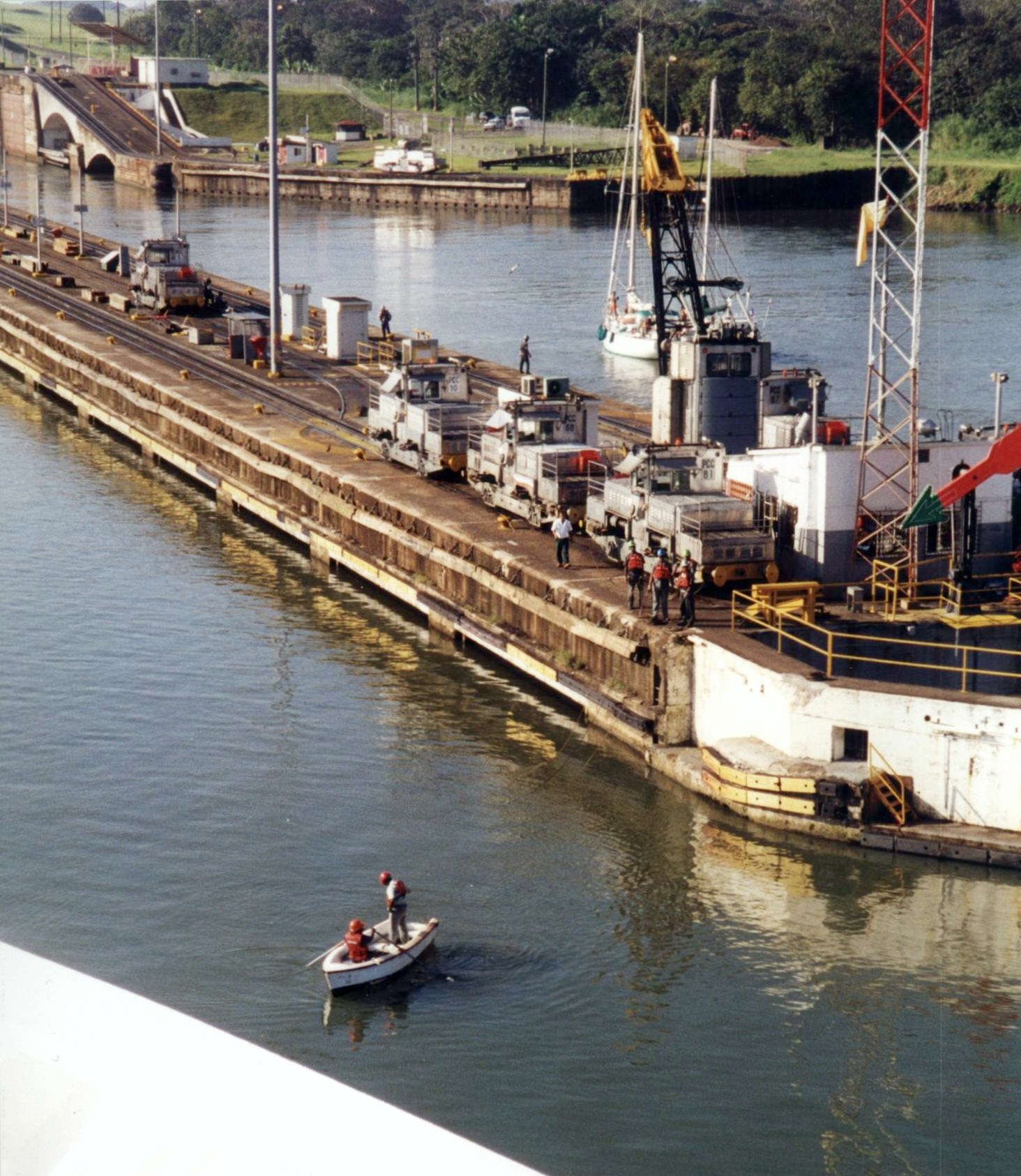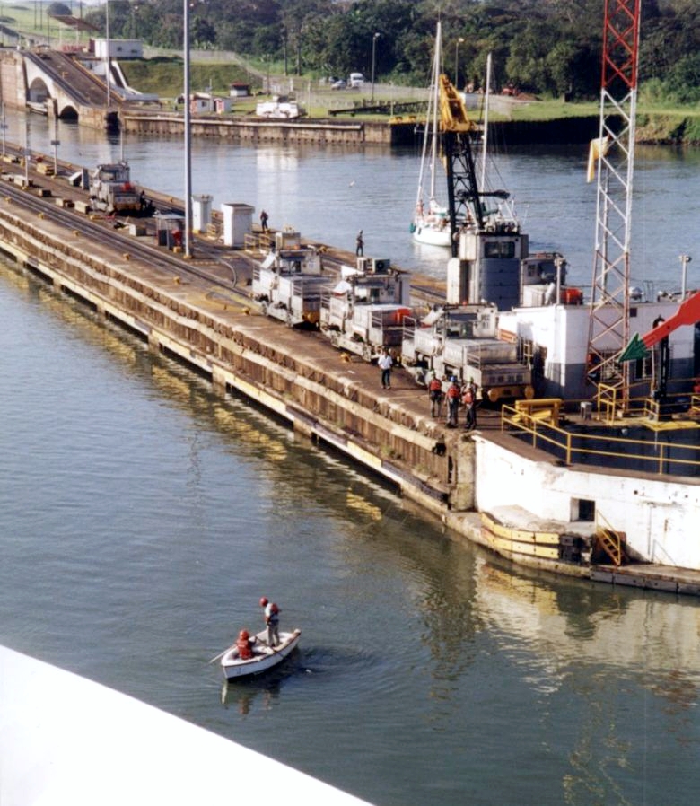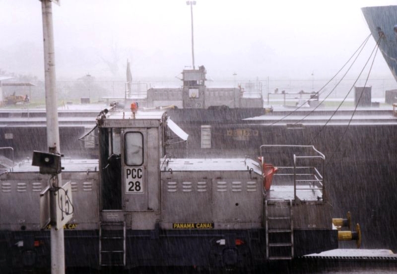 Out of the locks, into Gatun Lake. The mules start their trudge back