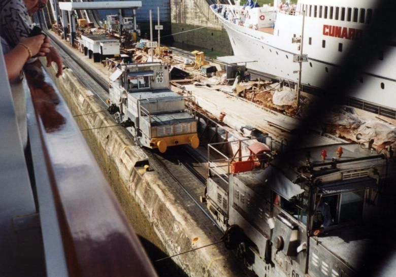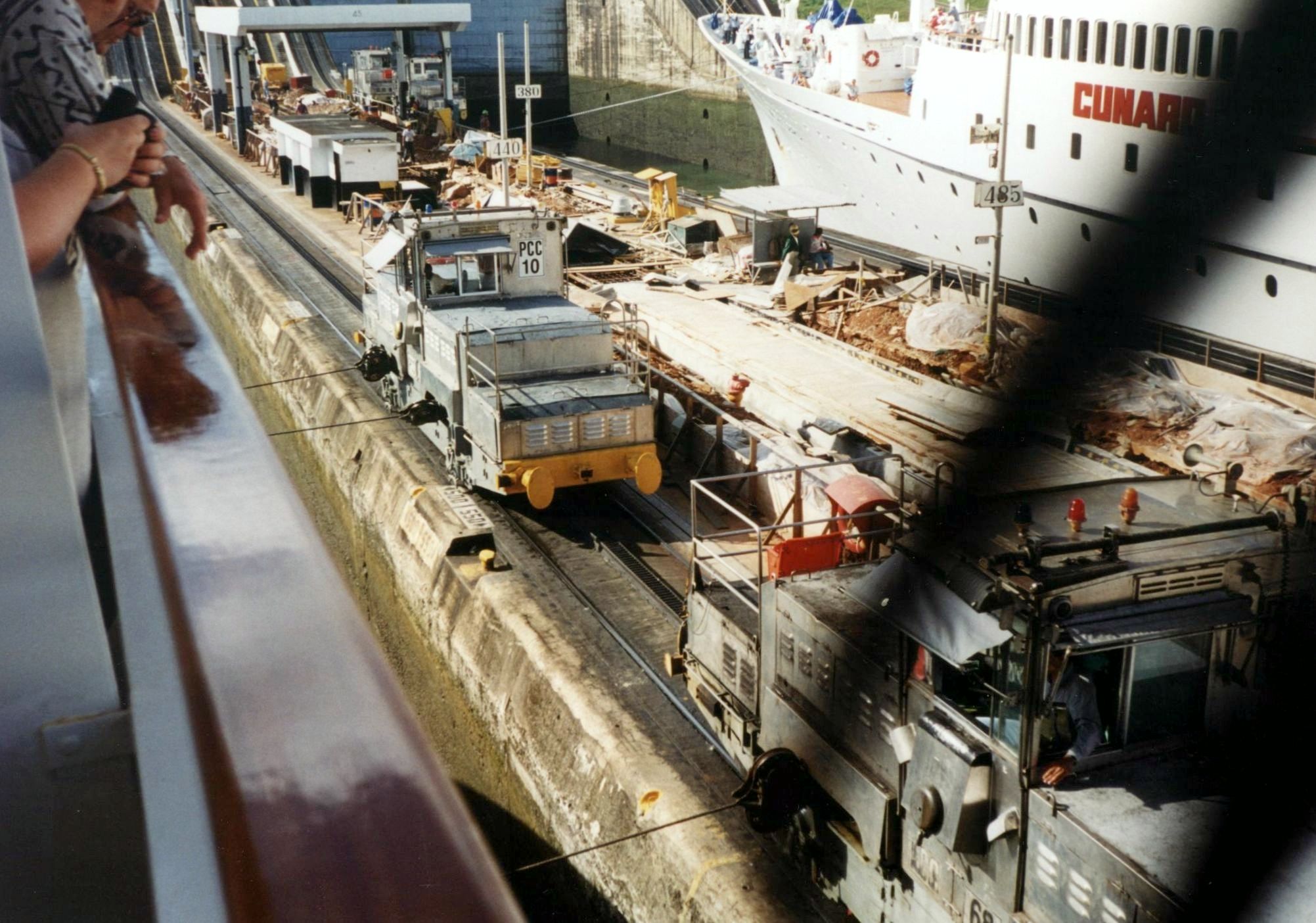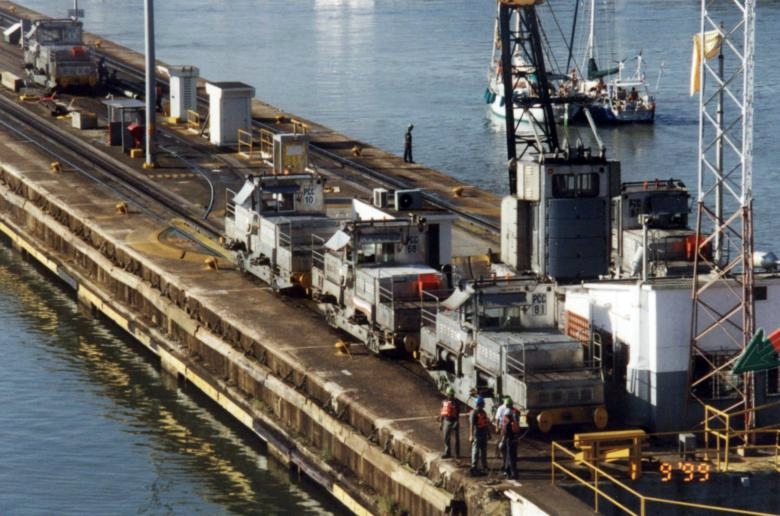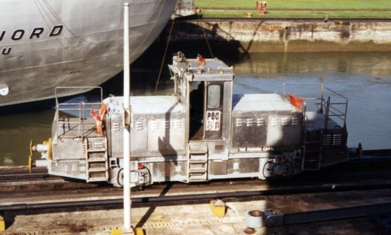 The front mule next to the control tower Notice the lock-gates on the opposite side swung/retracted into the lock wall, to give maximum passing room to the ships.