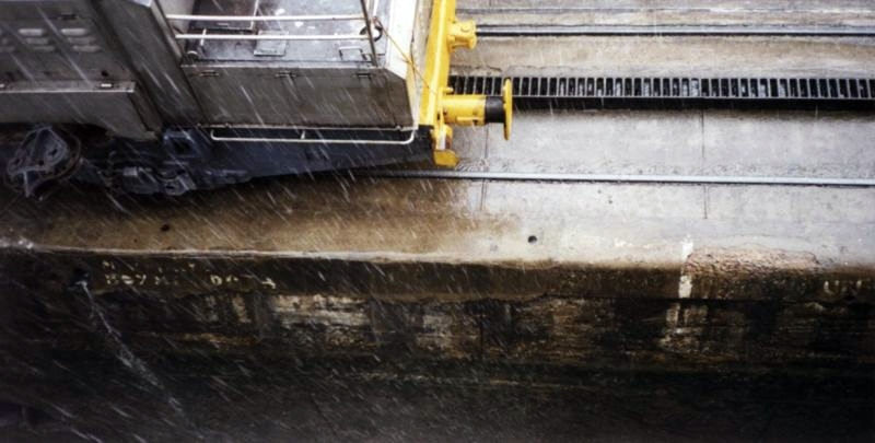 A Maersk container-carrier followed the Vistafjord (and the tug and sailboats) into the right-hand locks (Here, again, you can see the height differential, and this is just the first of the Atlantic-side locks!) Plus: Look down, too – you can't see the water from the Symphony – that's how tight a squeeze it is!