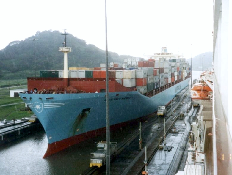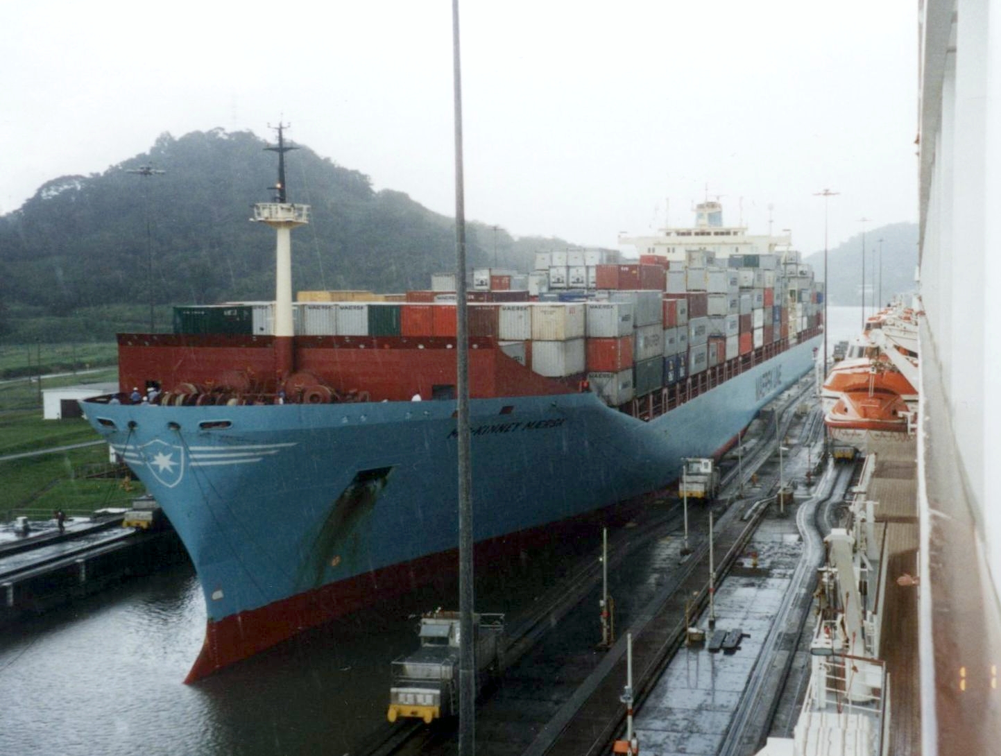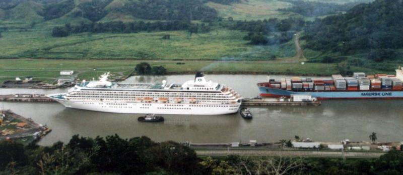 The Crystal Symphony next to the Maersk container carrier entering the Pedro Miguel locks,