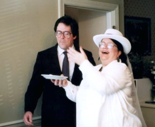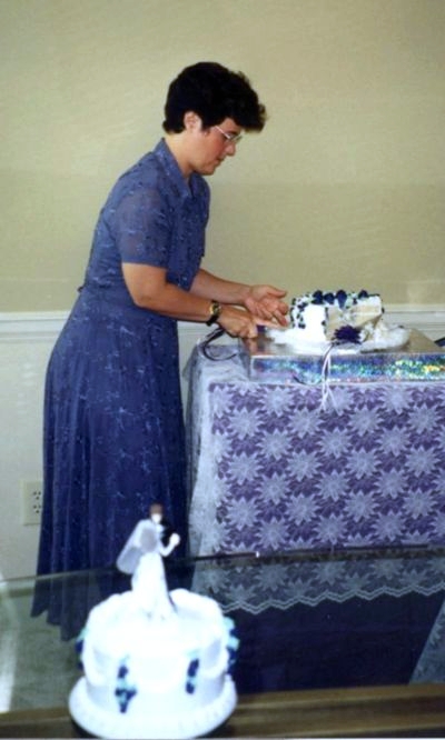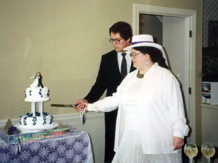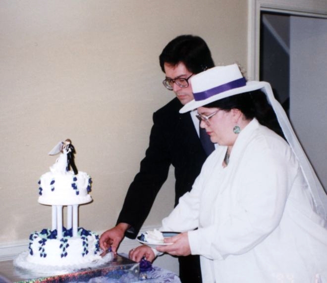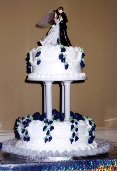 The cake was made by the local Publix supermarket (!!) with purple flowers and white creme frosting. Yum! Elenor painted the yellow flowers on the cake-topper purple too. (Purple was Stevie Ray Vaughan’s favourite color, and so, was the “accent” colour for the wedding!!)